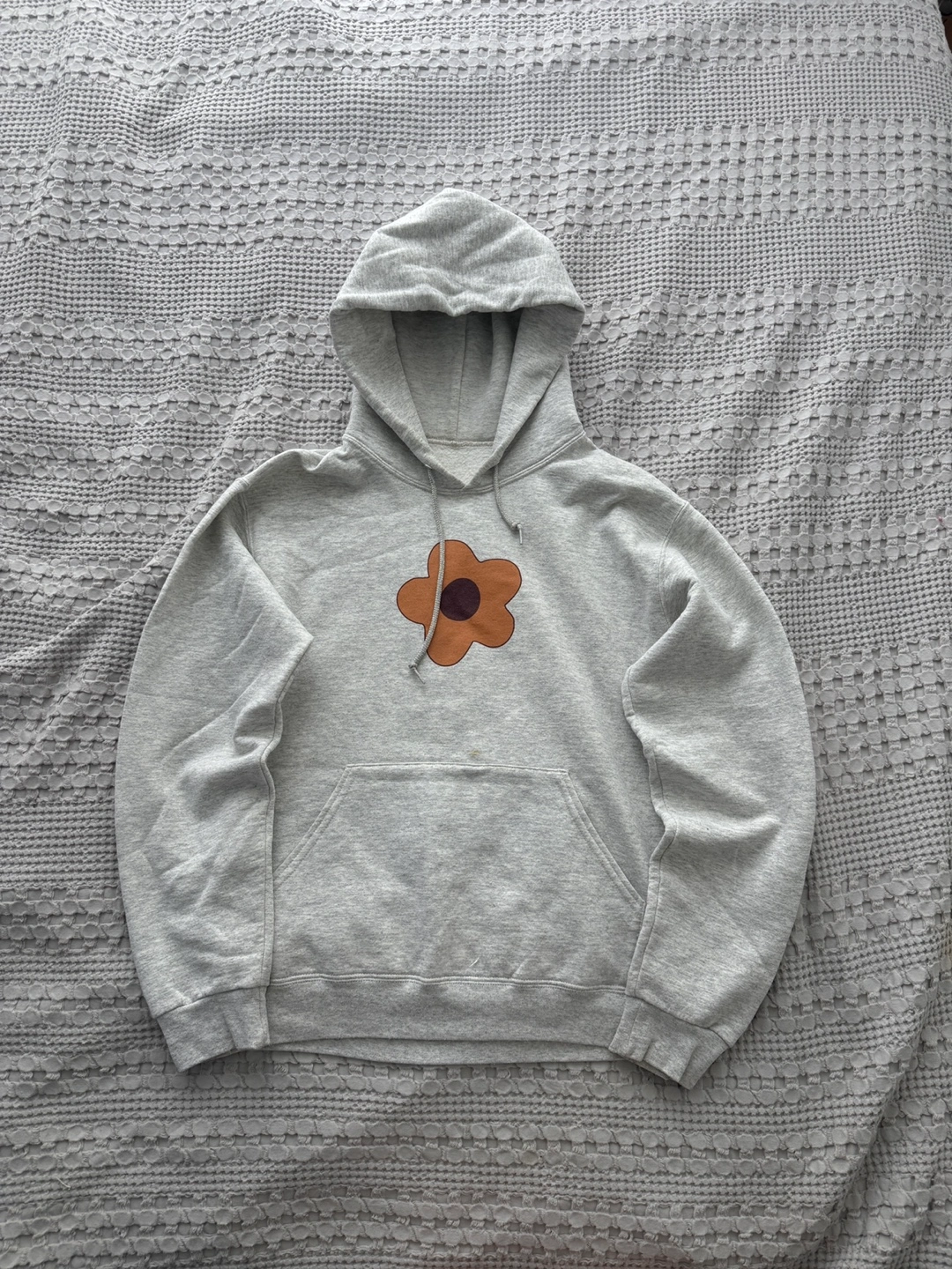 224Grey pullover hoodie. Features a brown flower on the front and "NATURE LOVER" with three brown flowers on the back. Size small.