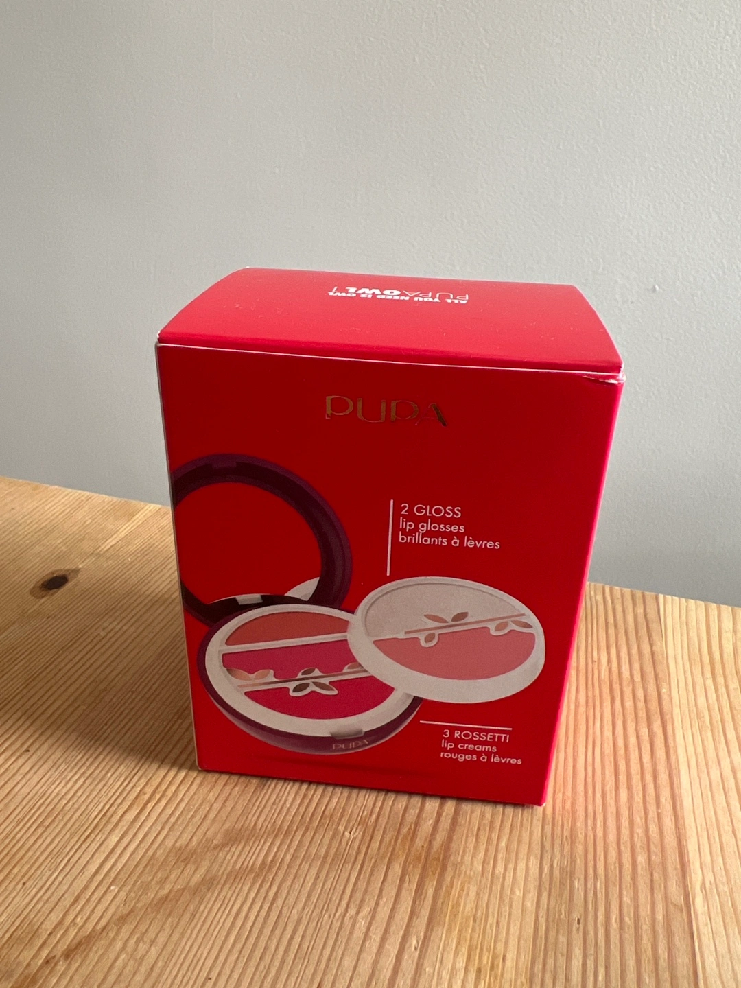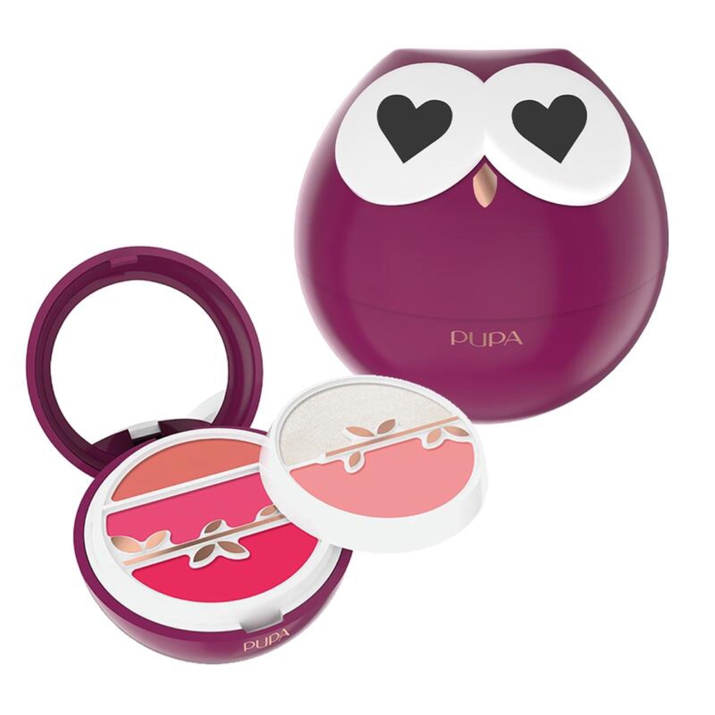 Cute owl-shaped makeup kit. Contains various shades of blush and lip products. Compact mirror included. New and unopened.