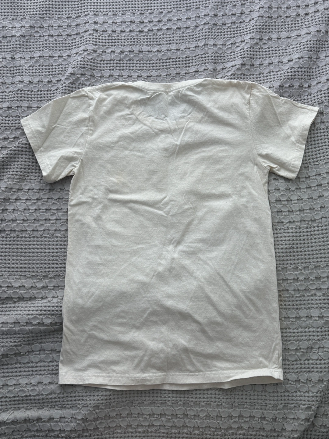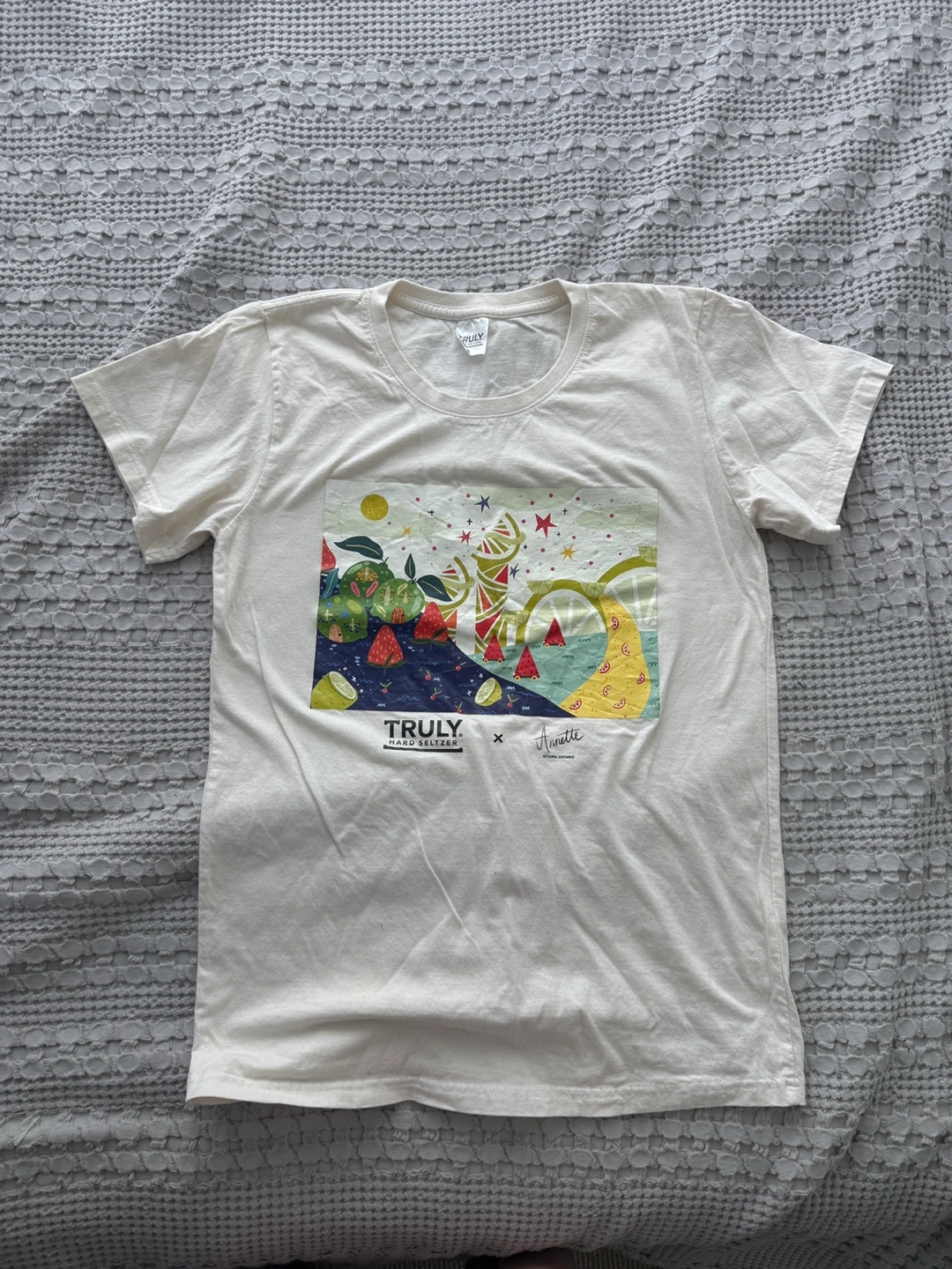 224Cream-coloured t-shirt. Features a colourful fruit-themed graphic on the front. Size small. Back is plain. Short sleeves. Good condition.