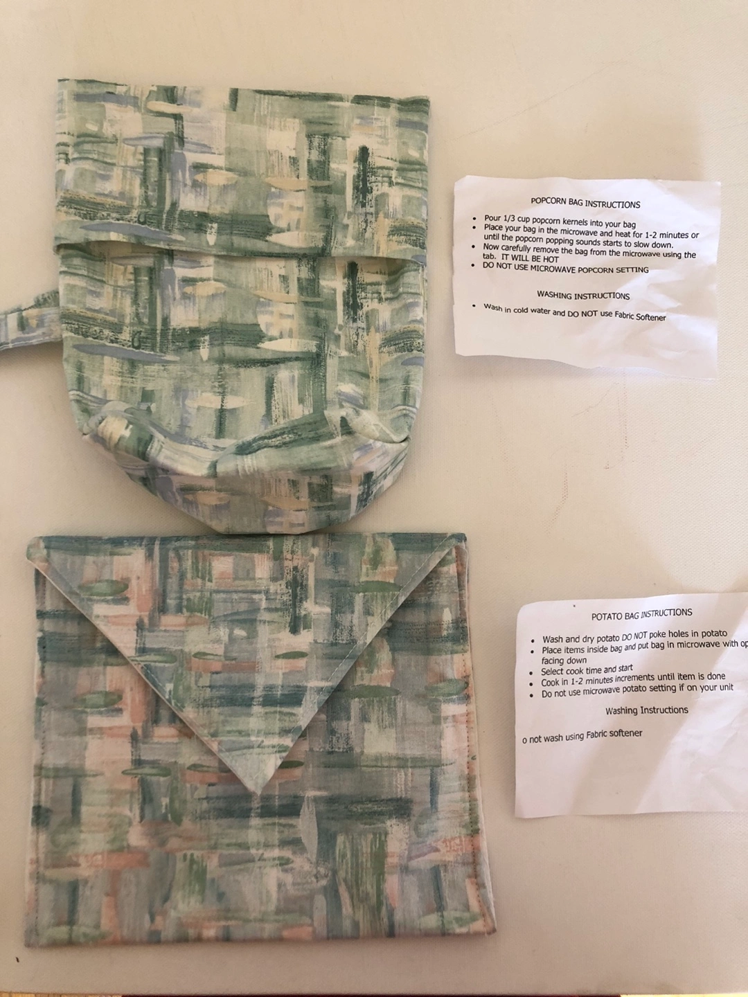 Set of two reusable fabric bags. One for popcorn and one for potatoes. Microwave safe. Features an abstract pattern material. Includes care instructions. Never used. Could give as a gift. Yonge/Davisville pick up.
