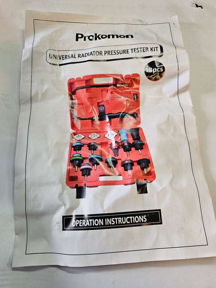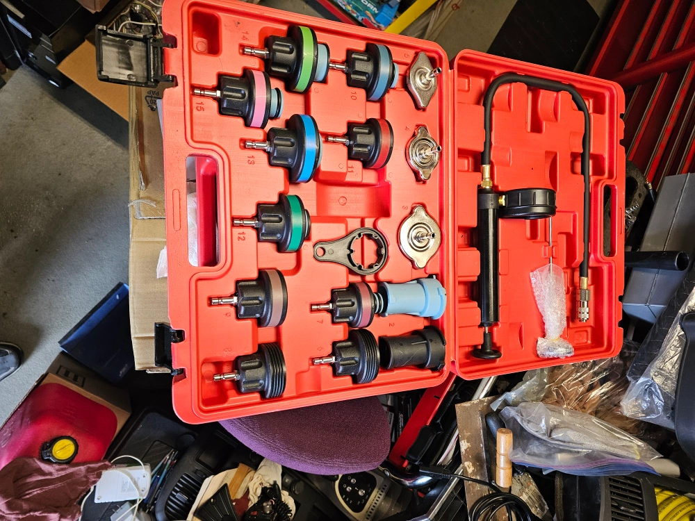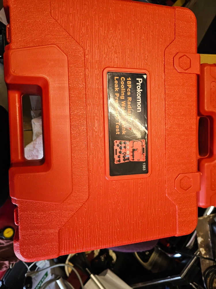 Complete radiator pressure test kit. Includes pressure gauge, various sized caps, and other tools. Great for vehicle maintenance. Stored in a convenient red plastic carrying case. Instructions included.
