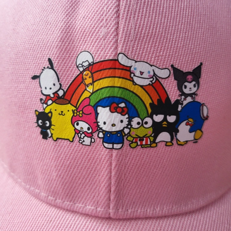 Adorable pink baseball cap. Features a rainbow and various Sanrio characters. 100% polyester. Adjustable strap.