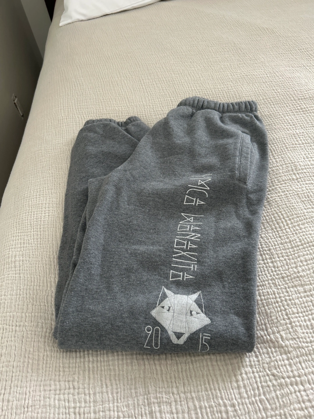 Grey sweatpants. Features a fox graphic and the year 2015. Drawstring waistband and cuffed ankles. Comfortable and cozy. YMCA Wanakita