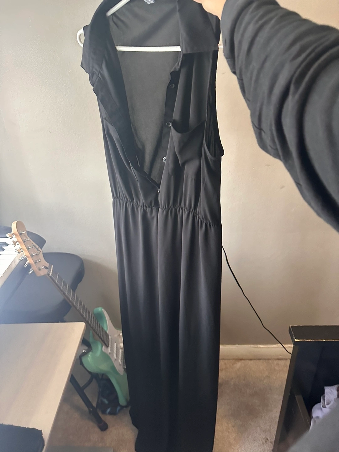 202Black maxi dress. Sleeveless. Collared. Button-down. Sheer panel. Elastic waist. Size L/G. Made in China.
