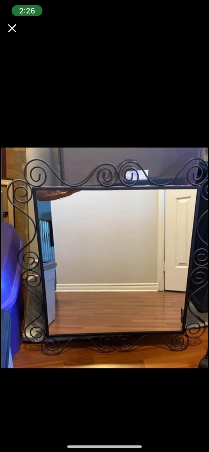 Large square mirror. Black metal frame with decorative scrollwork. Wall mount.