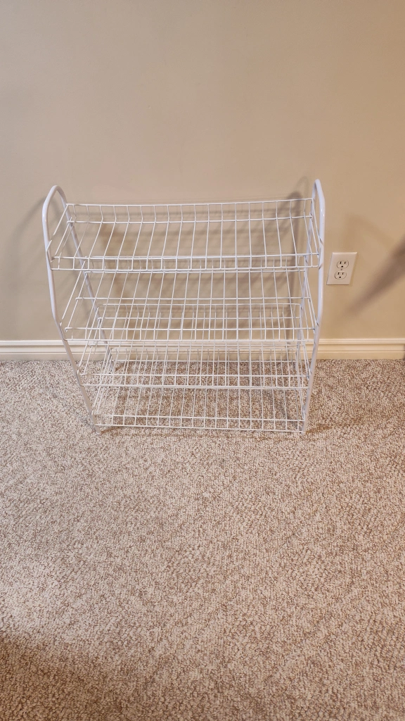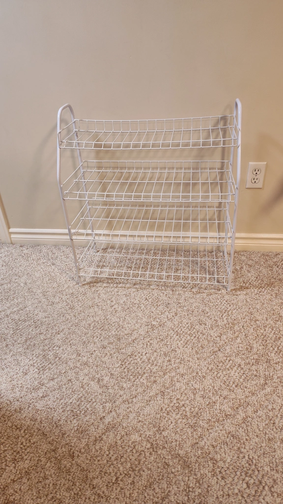 Four-tier shoe storage. White wire metal frame. Great for organizing shoes. Lightweight and easy to assemble. Like new condition.