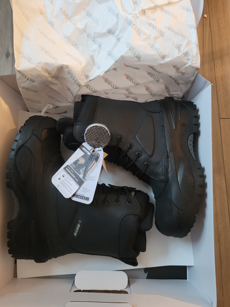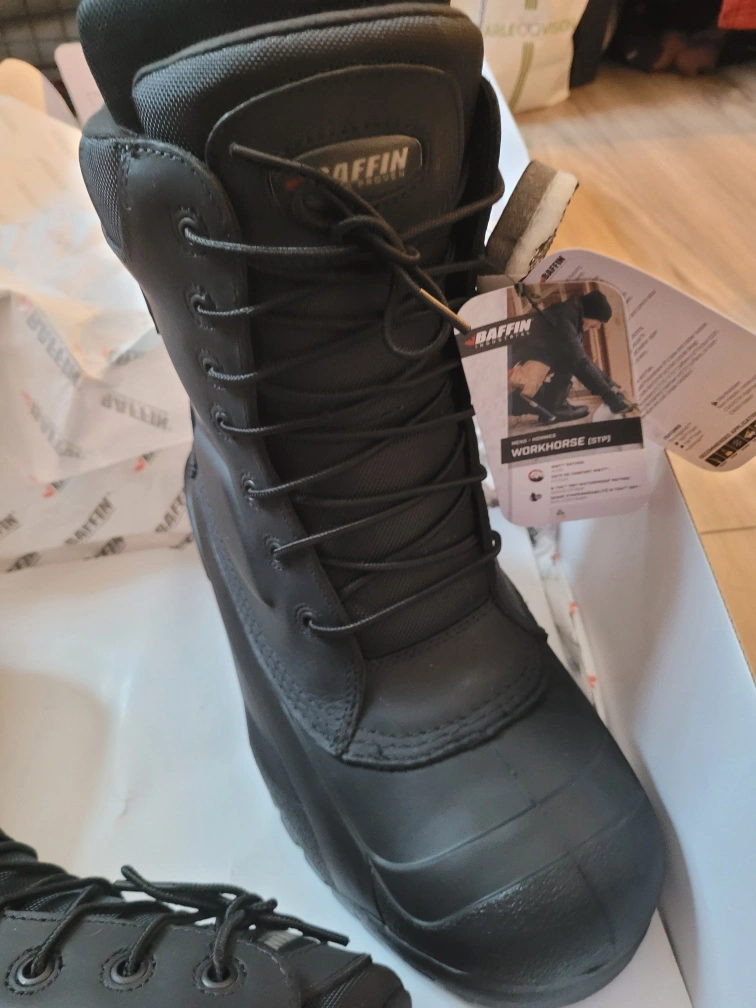 Brand new, never worn in box. Men's size 10. Black leather and rubber winter boots. Lace-up style. Workhorse EXP model. Excellent traction. >$300 in store..