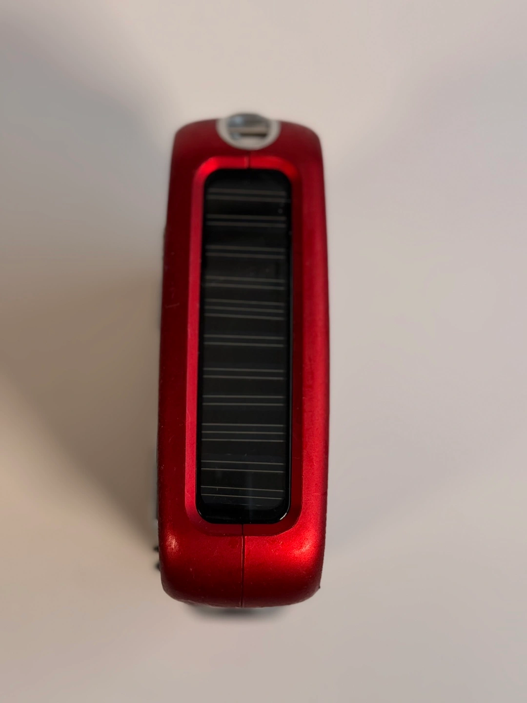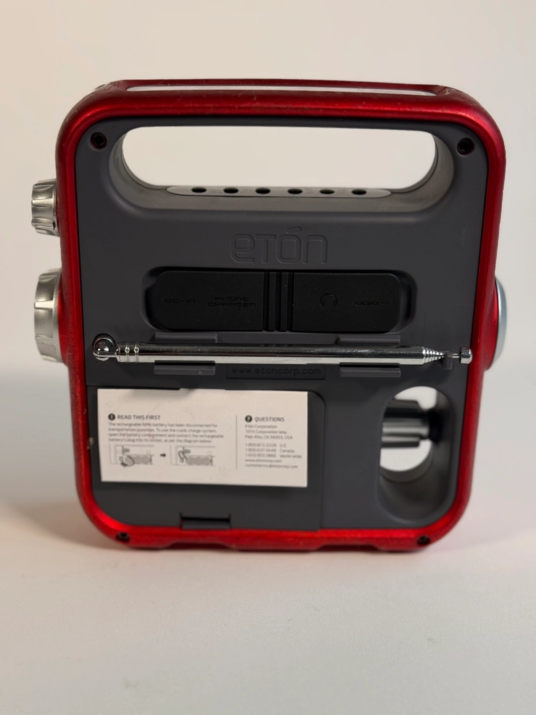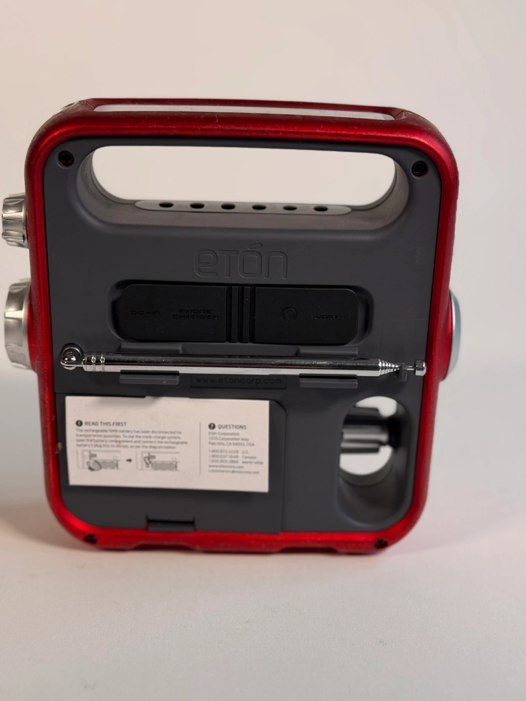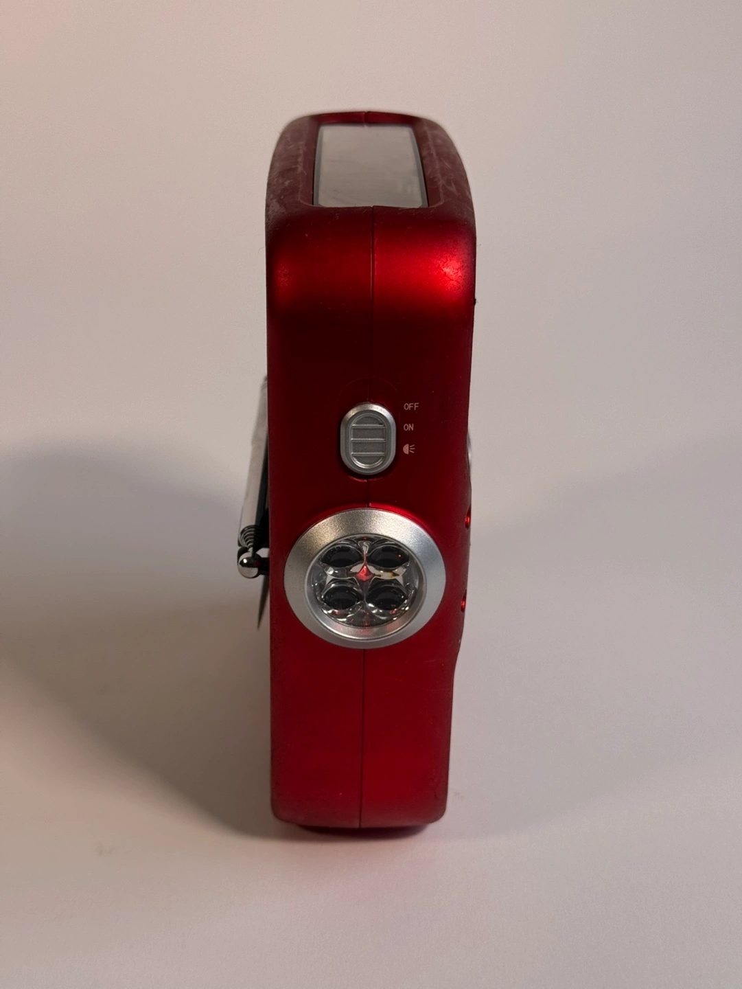 Portable emergency radio. Features solar panel, hand crank, flashlight, and AM/FM radio. Red casing, grey accents. Includes a telescoping antenna.