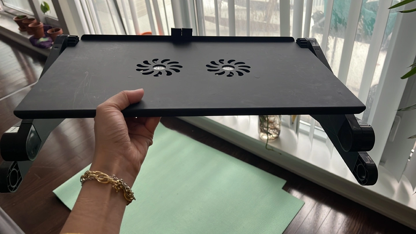 Foldable laptop stand with two cooling fans. Adjustable height. Black plastic construction. Great for home or office use.
