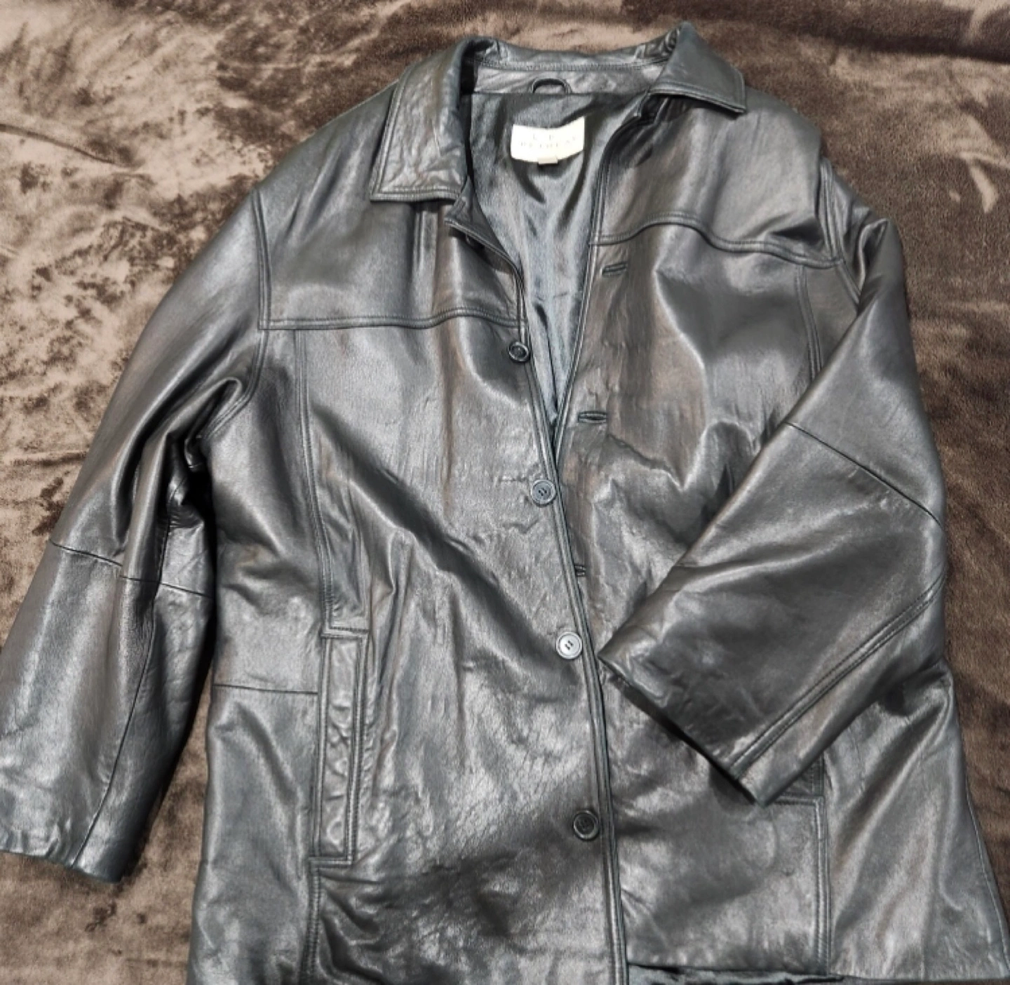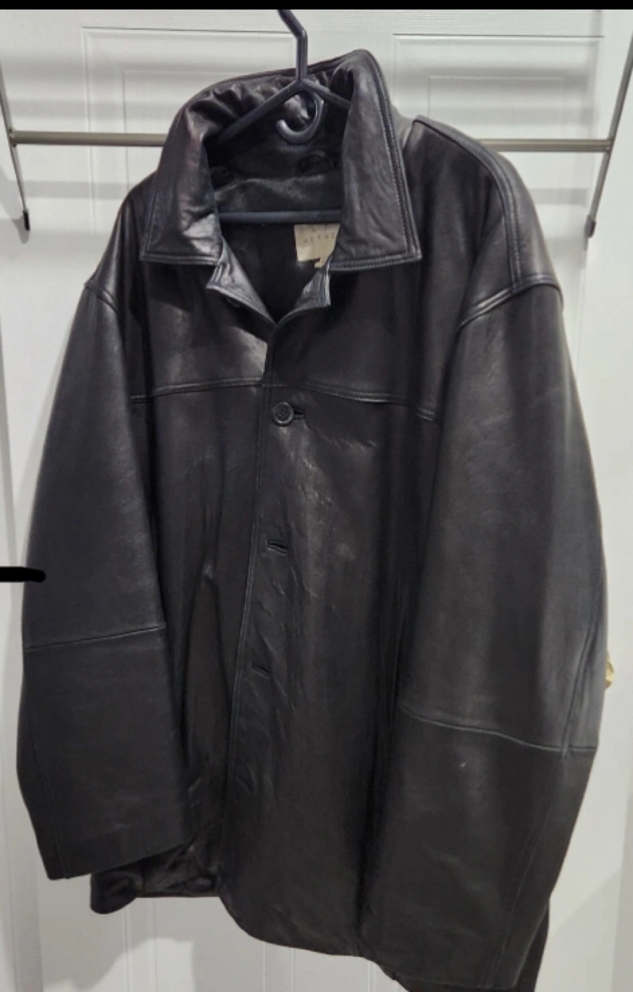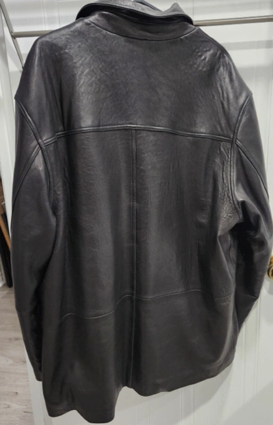 Black leather jacket. Thinsulate insulation to keep you warm. 100% leather shell with polyester lining. Features button closure and pockets.