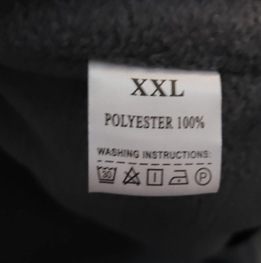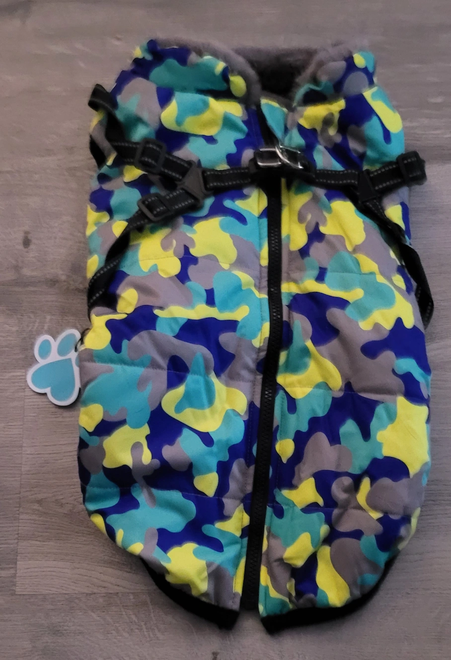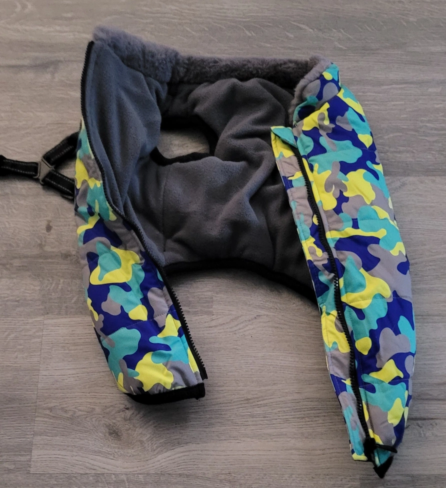 Warm dog winter jacket. Size XXL. Camo print. Fleece lining. Zipper closure. 100% polyester. Comes with built in harness.