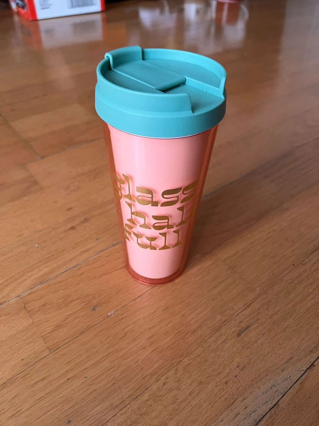 236Reusable travel tumbler. Features a pink body with gold lettering and a teal lid. Perfect for coffee or tea.