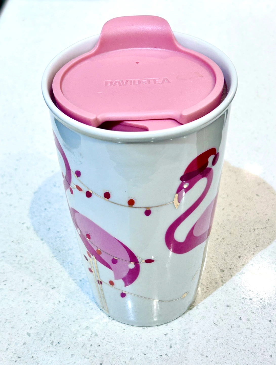 Came across this cute David’s Tea ceramic coffee/Tea Tumbler, never used. I’m not certain when I bought this! Cleaning out our coffee station and came across this! Looks like a 16oz.