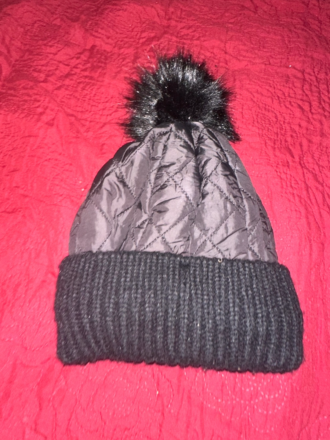 202Warm winter hat. Features a quilted top and a knit bottom. Black faux fur pompom. One size fits most.