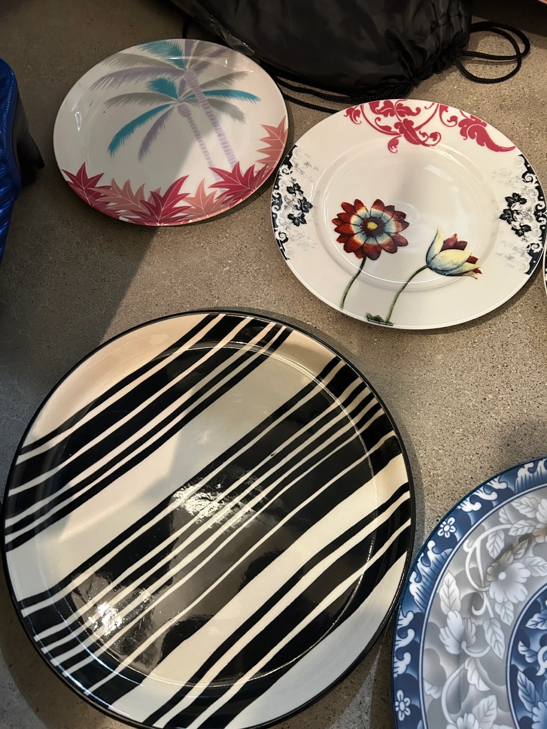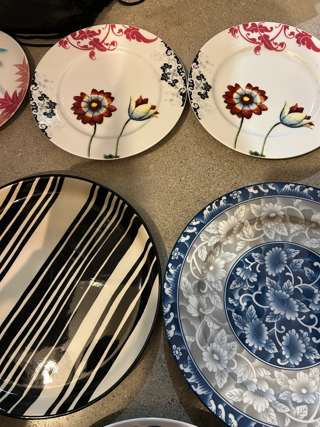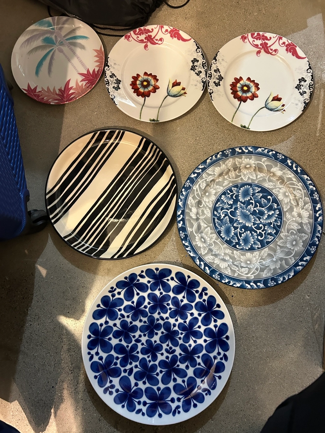Six plates, various designs and colours. Includes two matching floral plates, a black and white striped platter, and three other unique designs. Perfect for serving or display. Dishwasher and microwave safe. Pick up in the Beaches at Queen and Victoria Park.