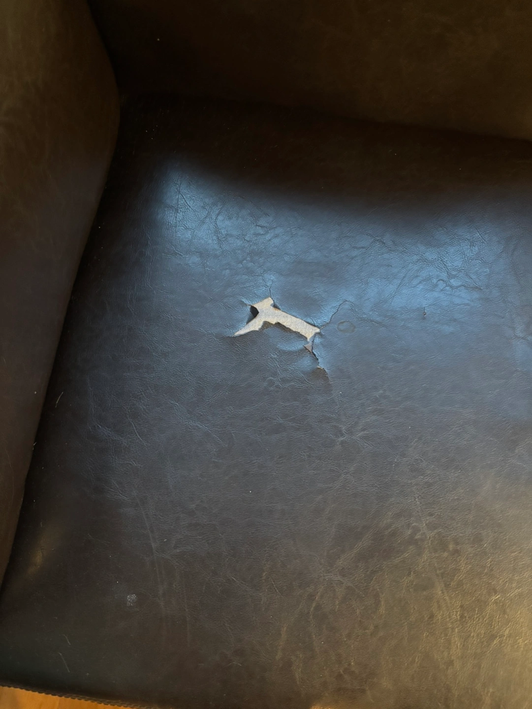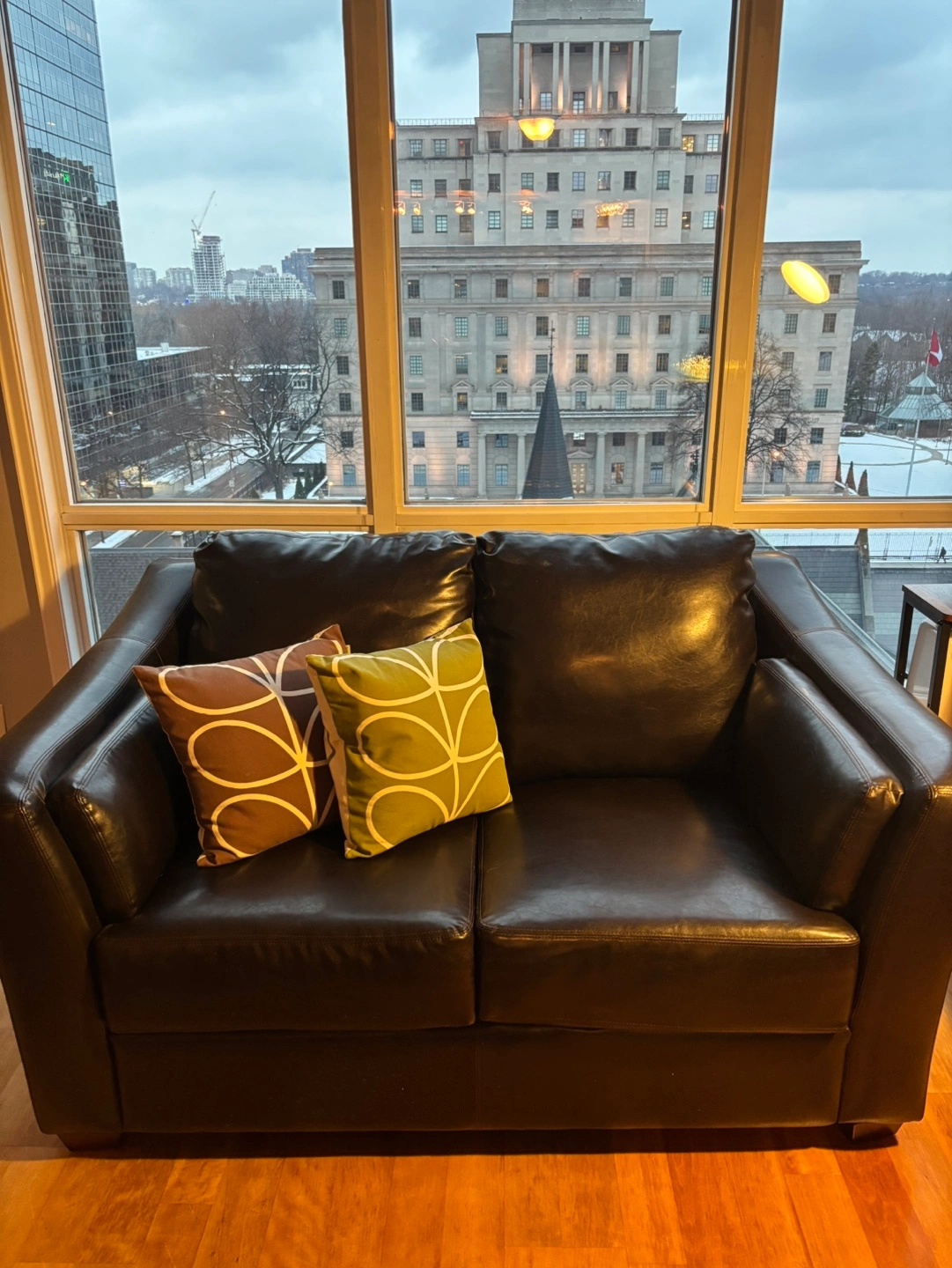 Comfortable dark brown faux leather loveseat. Ideal for condo living.