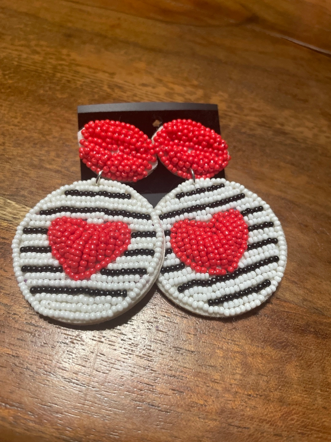Unique handmade beaded earrings. Features red hearts on a black and white striped background.