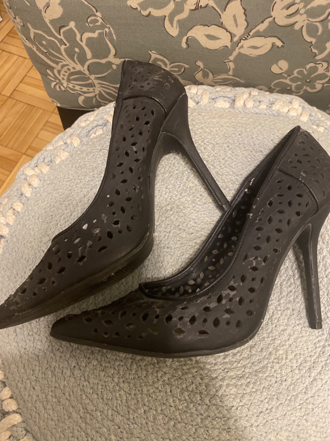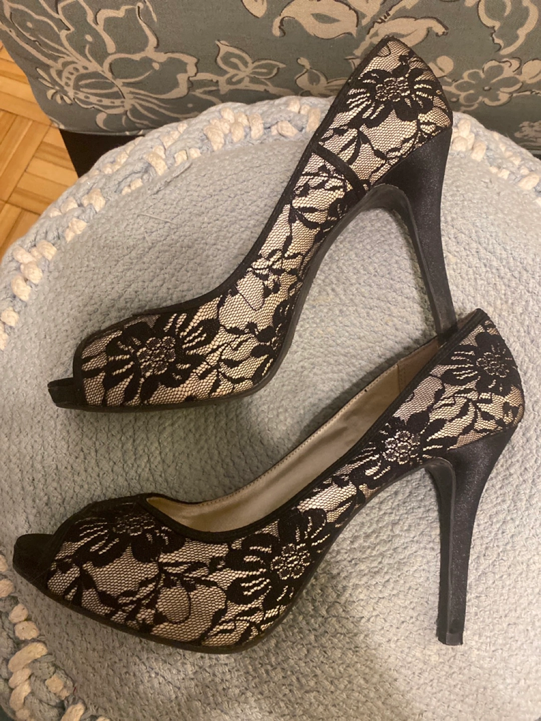 Collection of women's high heels. Includes floral print, black perforated, leopard print, blush pink, and black lace styles.