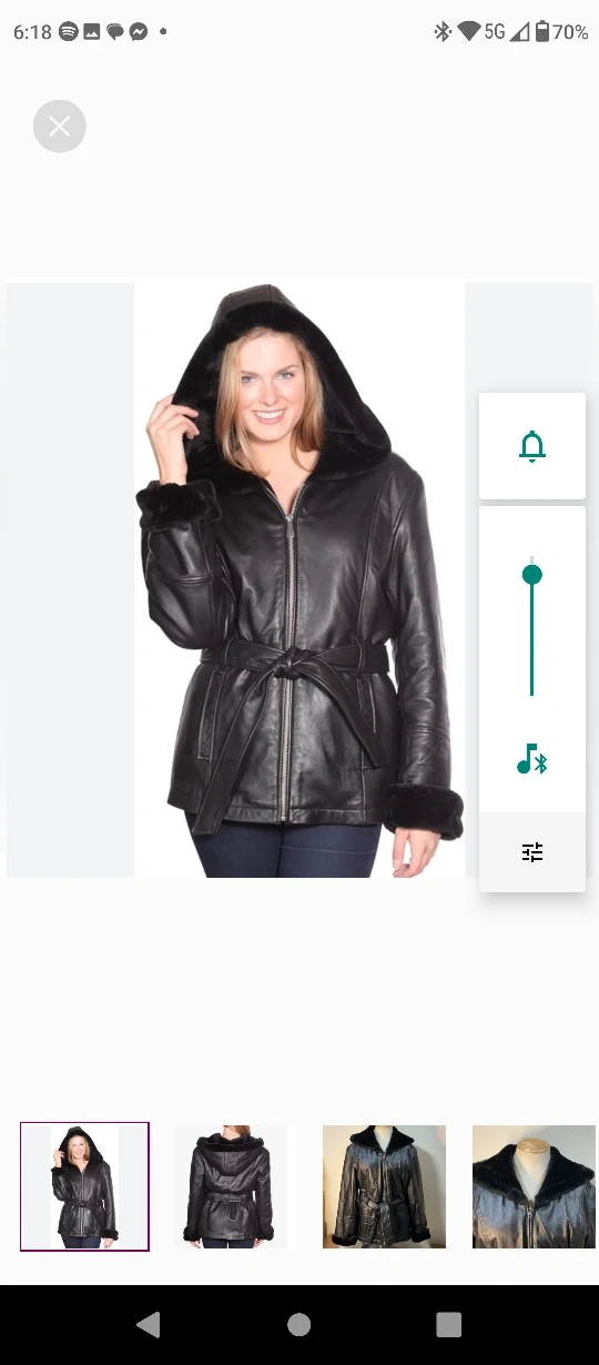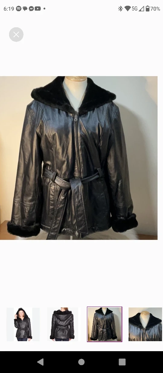 Women's black leather jacket. Features a faux fur trimmed hood and cuffs. Belted waist. Zip closure. Great for fall and winter.,real leather jacket ,with hood all fur lined.