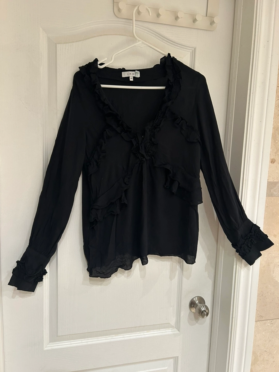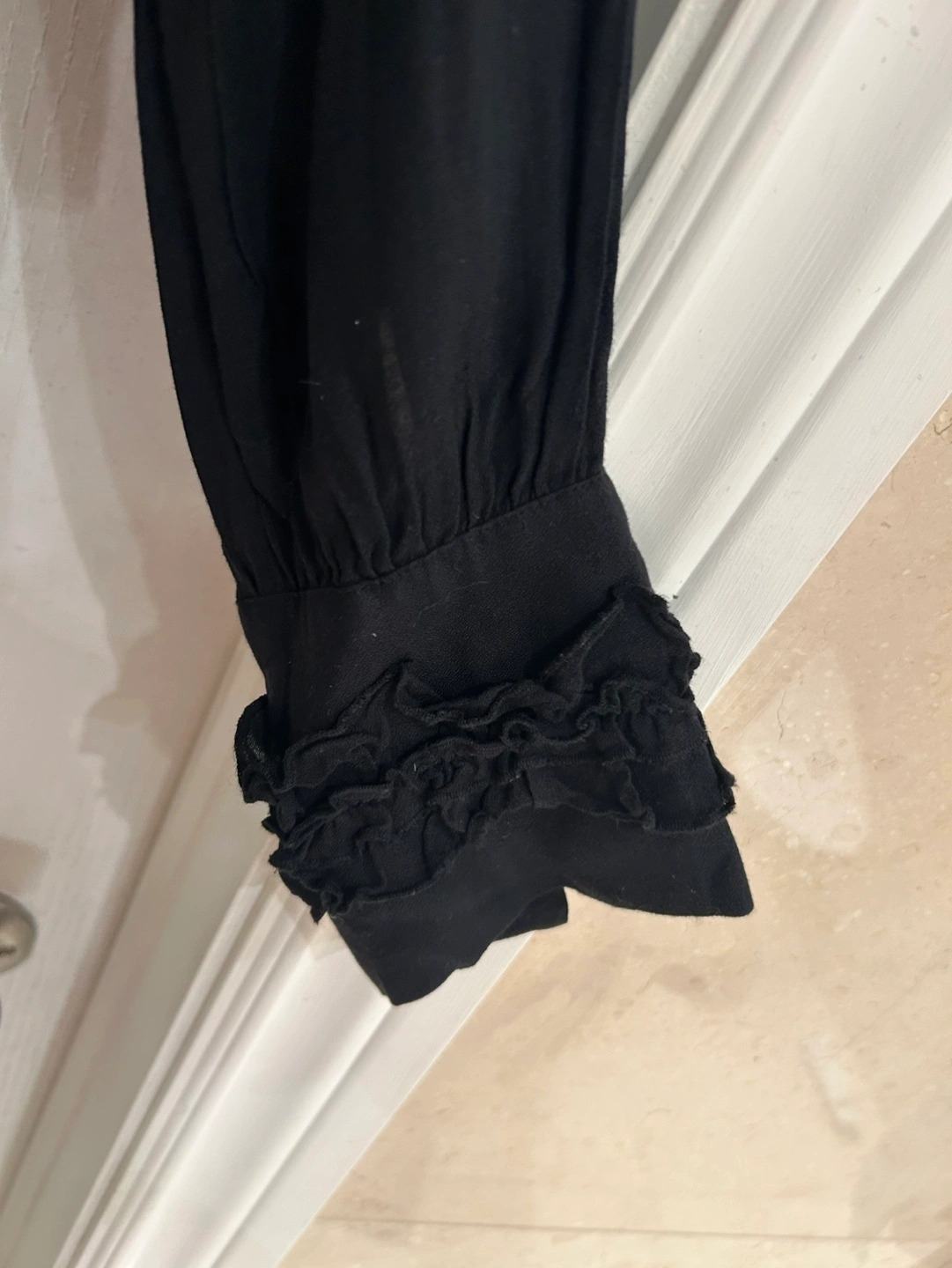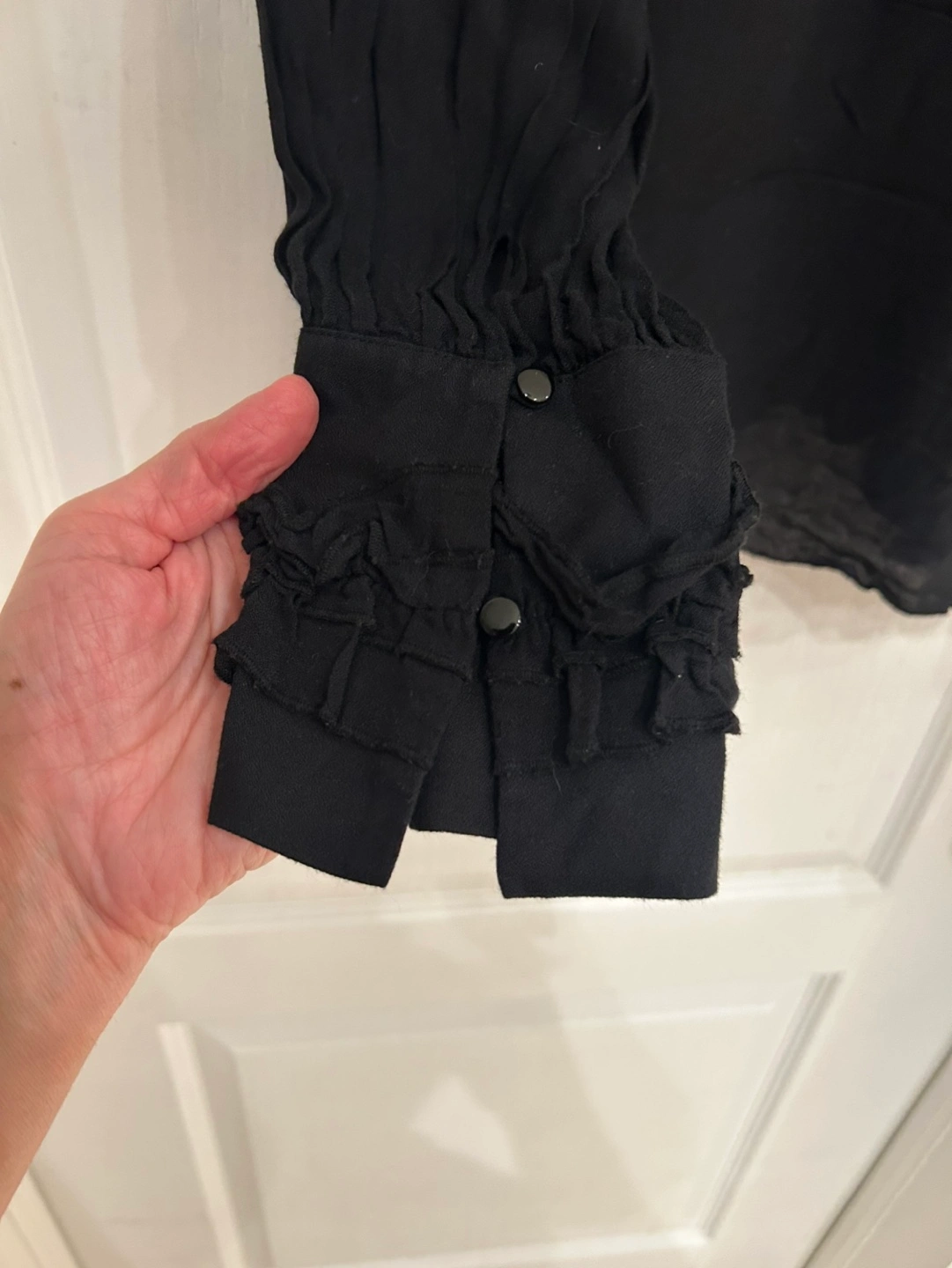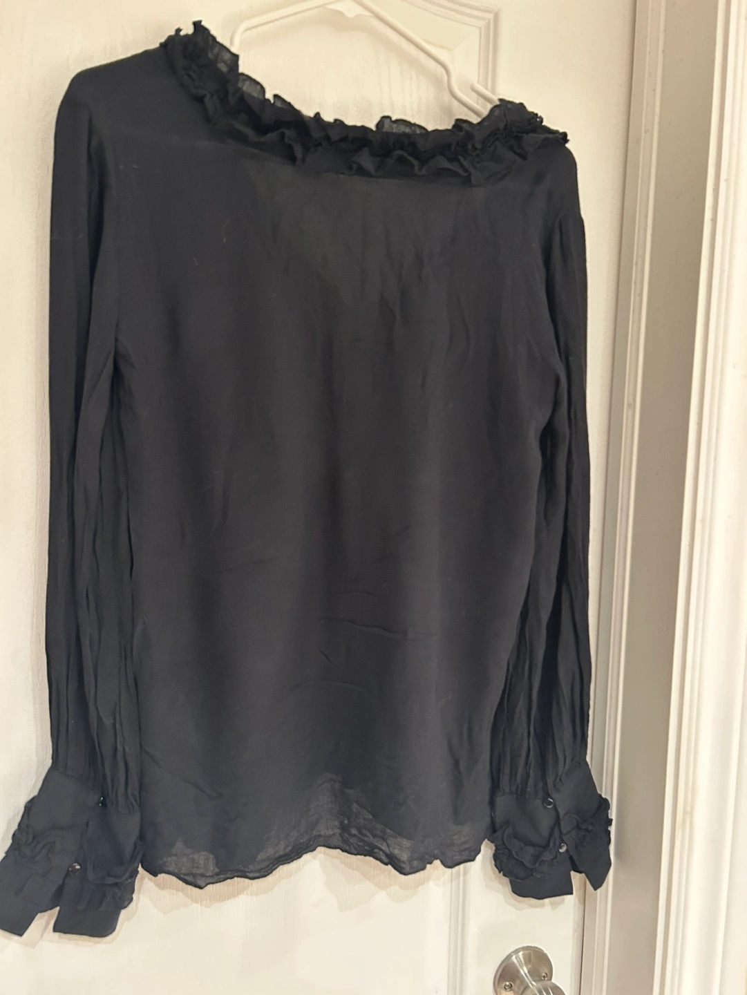 Long sleeve black blouse. Features ruffles at the neckline and cuffs. Size 34.