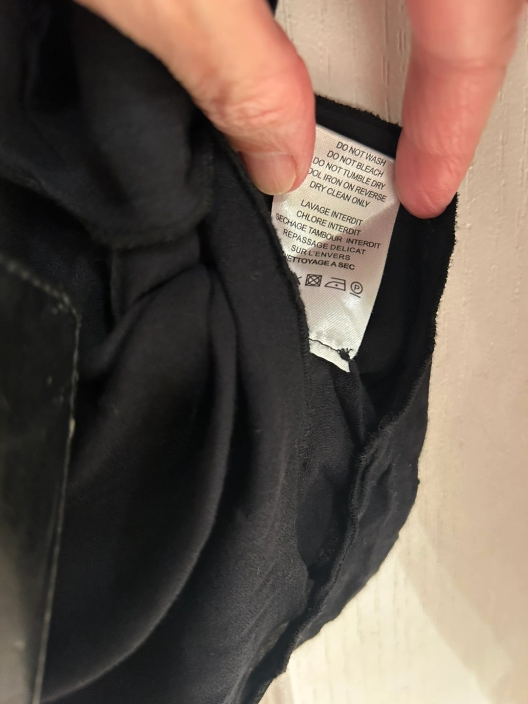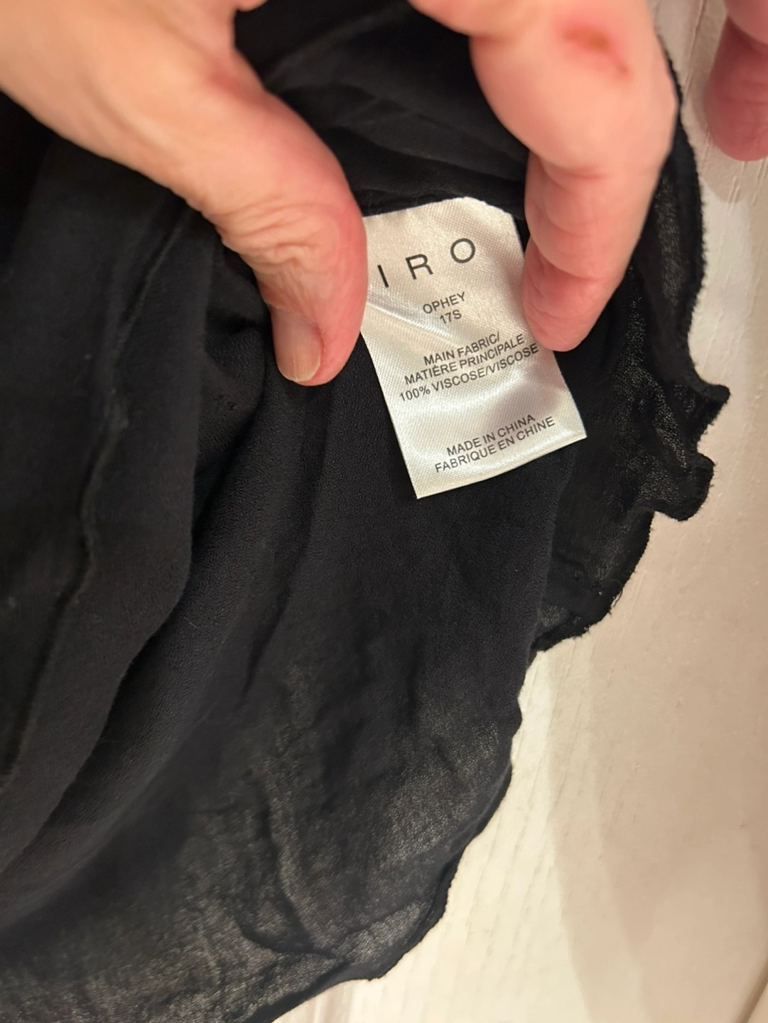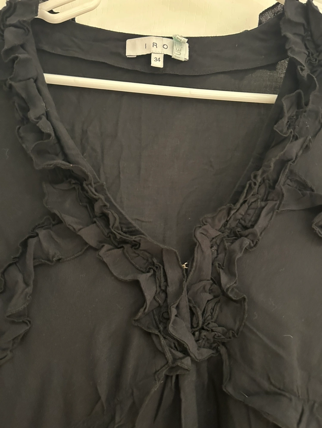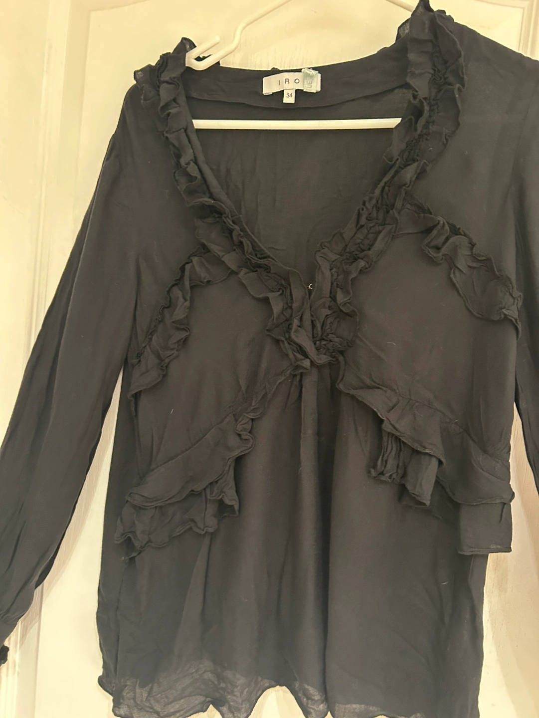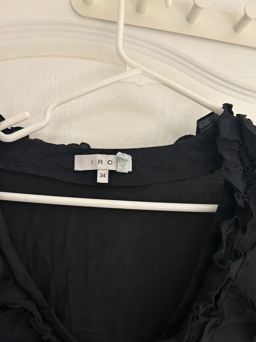 Long sleeve black blouse. Features ruffles at the neckline and cuffs. Size 34.