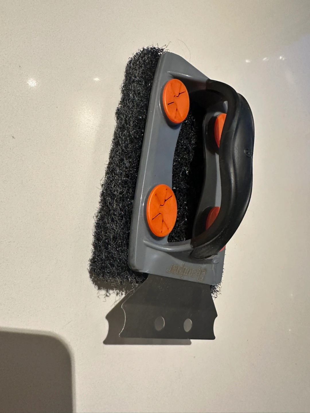 BBQ grill cleaning brush. Features a replaceable black scrubbing pad and a metal scraper. Ergonomic handle. Great for removing baked-on grease.