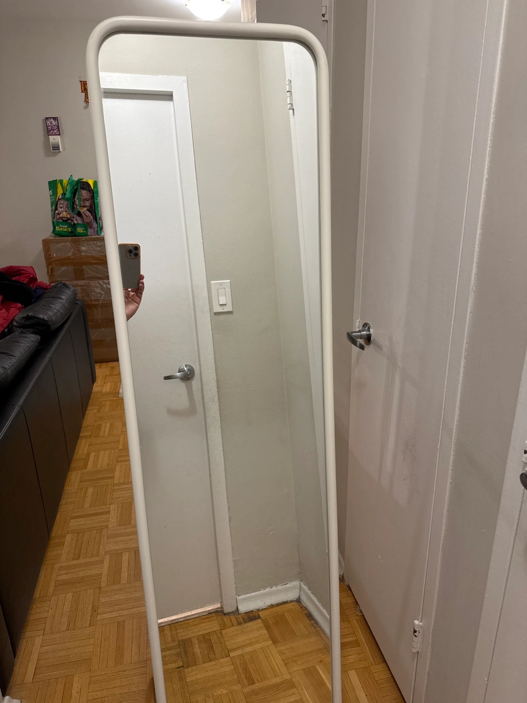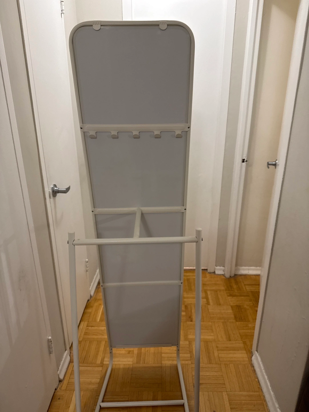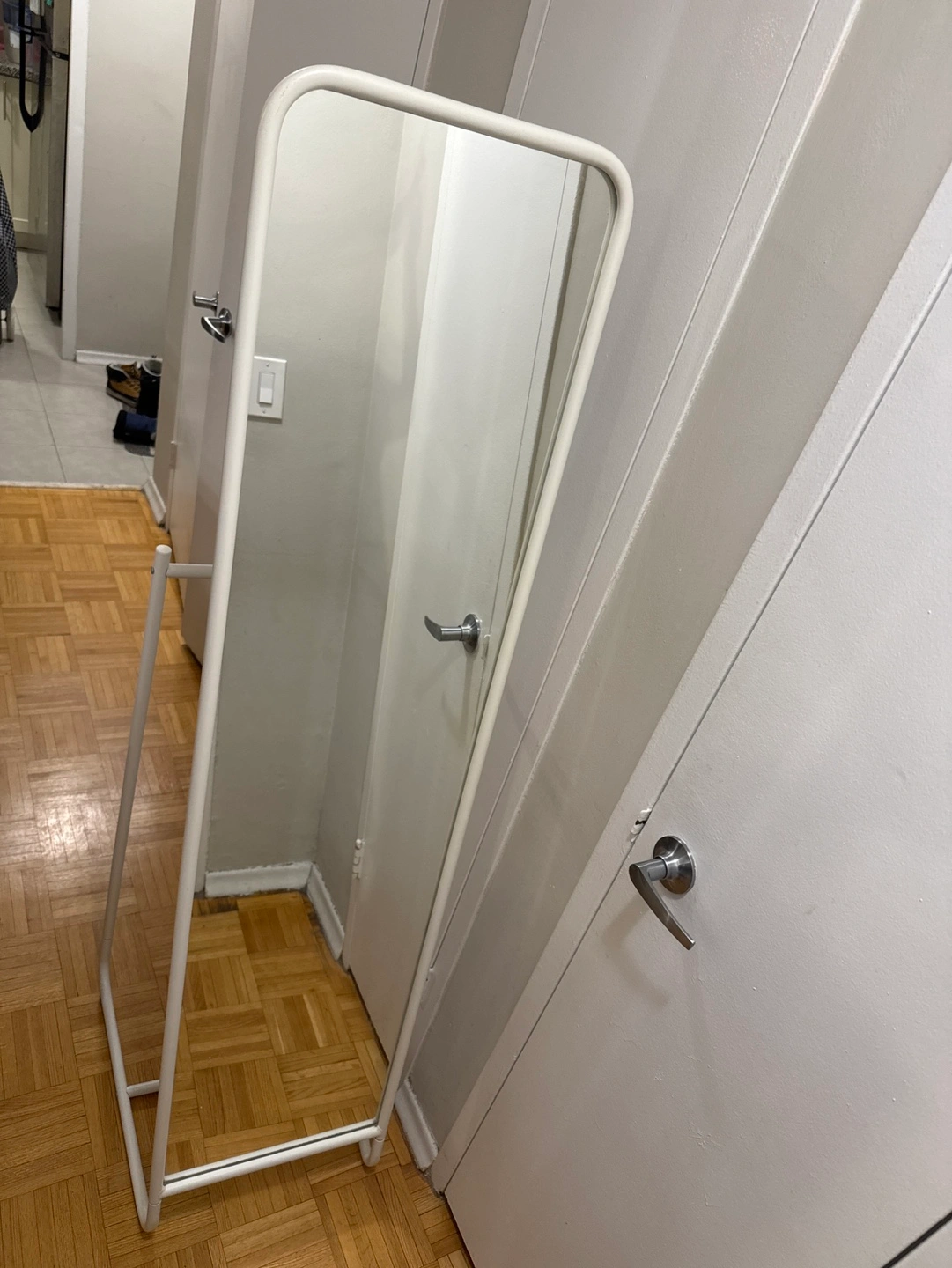 IKEA Freestanding full-length mirror. White frame. Small hooks on the back. Good condition. Lightweight and easy to move.