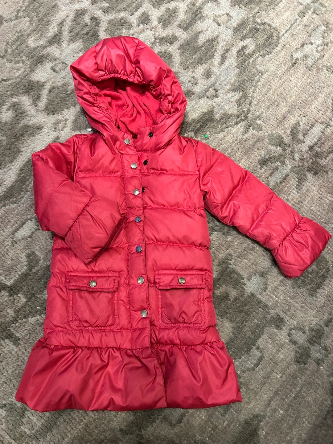Adorable pink puffer jacket. Size 5 toddler. Features a hood, snap closures, and pockets. Down and feather fill (75%!).