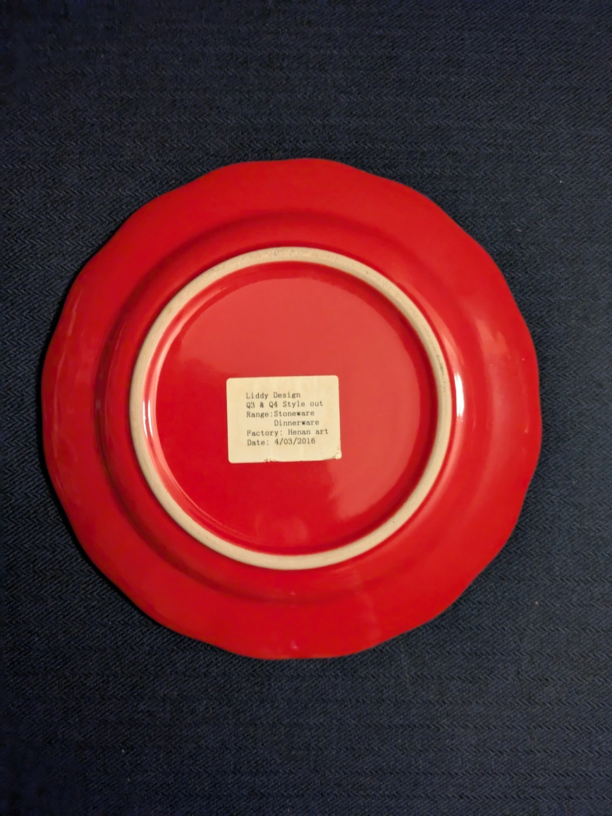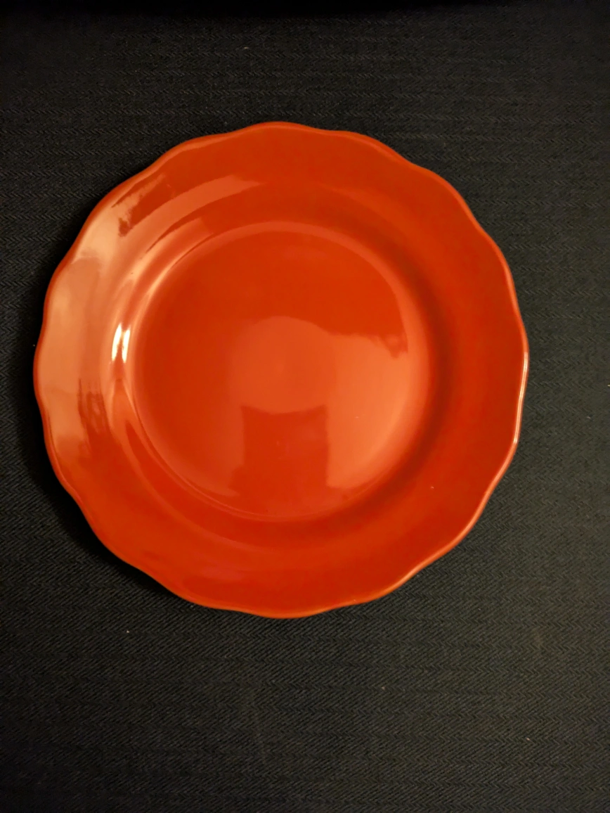 Collectible small cherry red decorative plate. Scalloped edge. Stoneware.