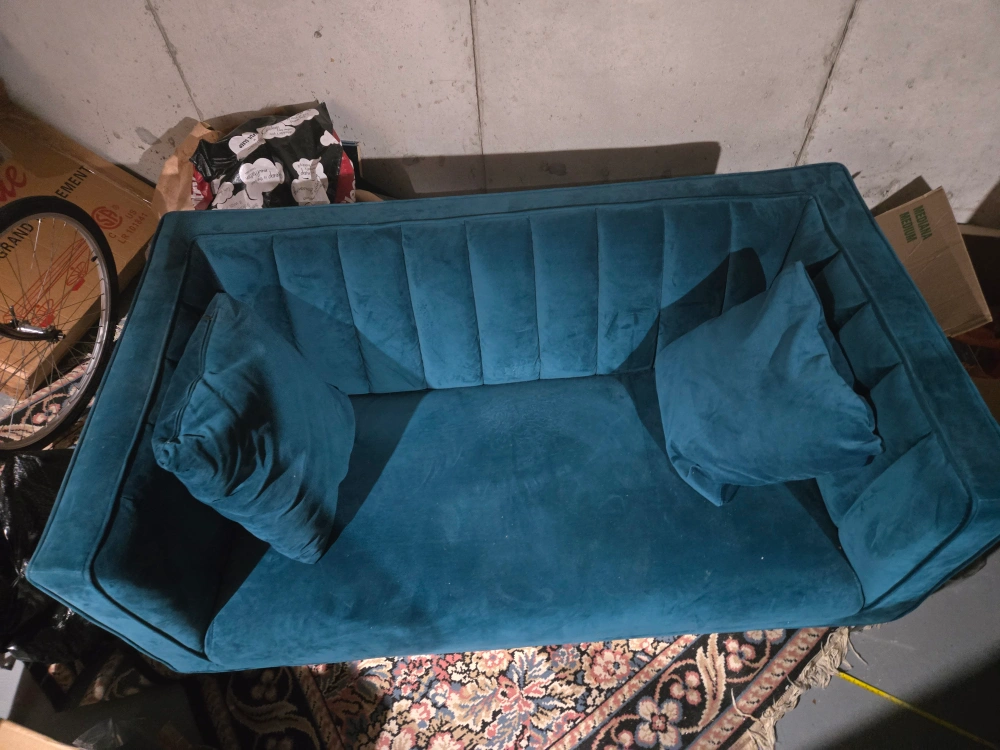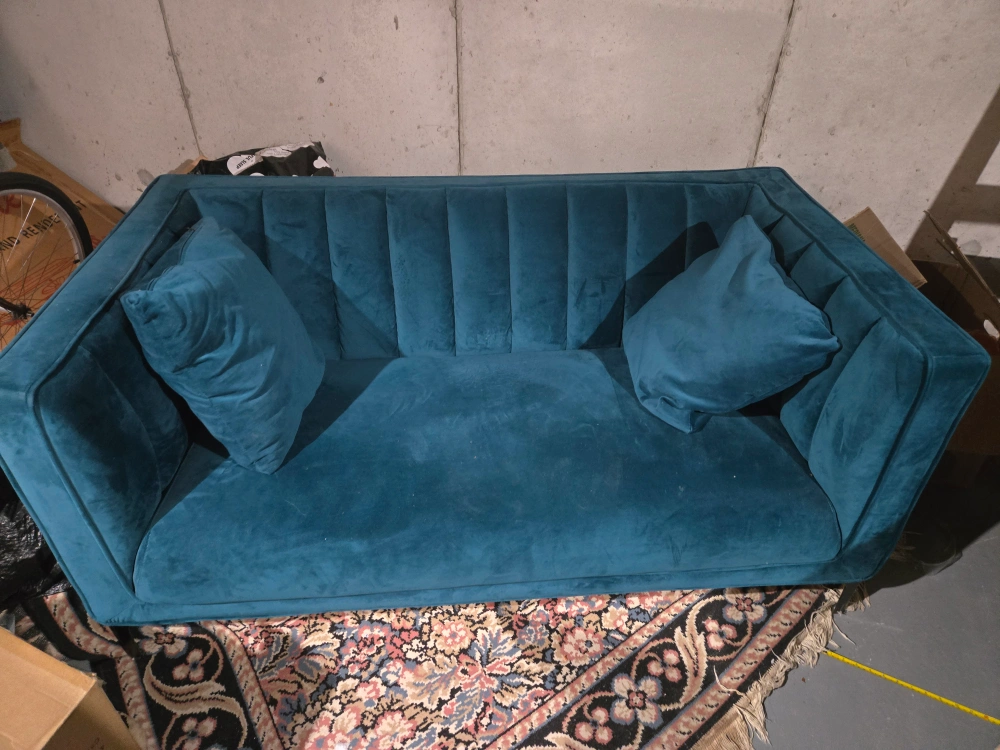 Beautiful teal velvet sofa. Two accent pillows included. Modern design. Great addition to any living room. Super comfortable. The colour on this is stunning! The couch is in excellent condition. 59 inches wide 28 inches high 32.5 inches deep