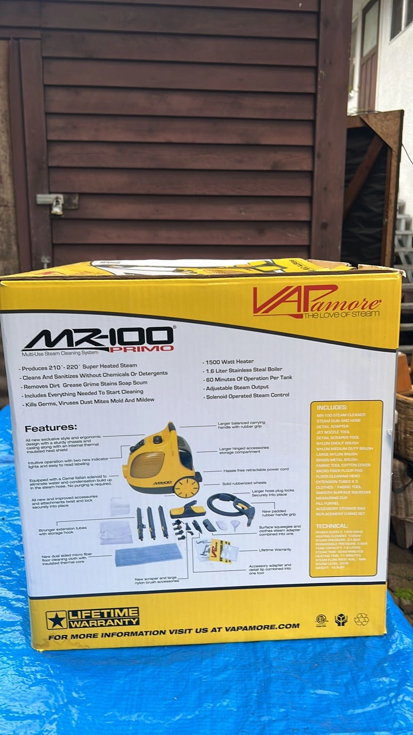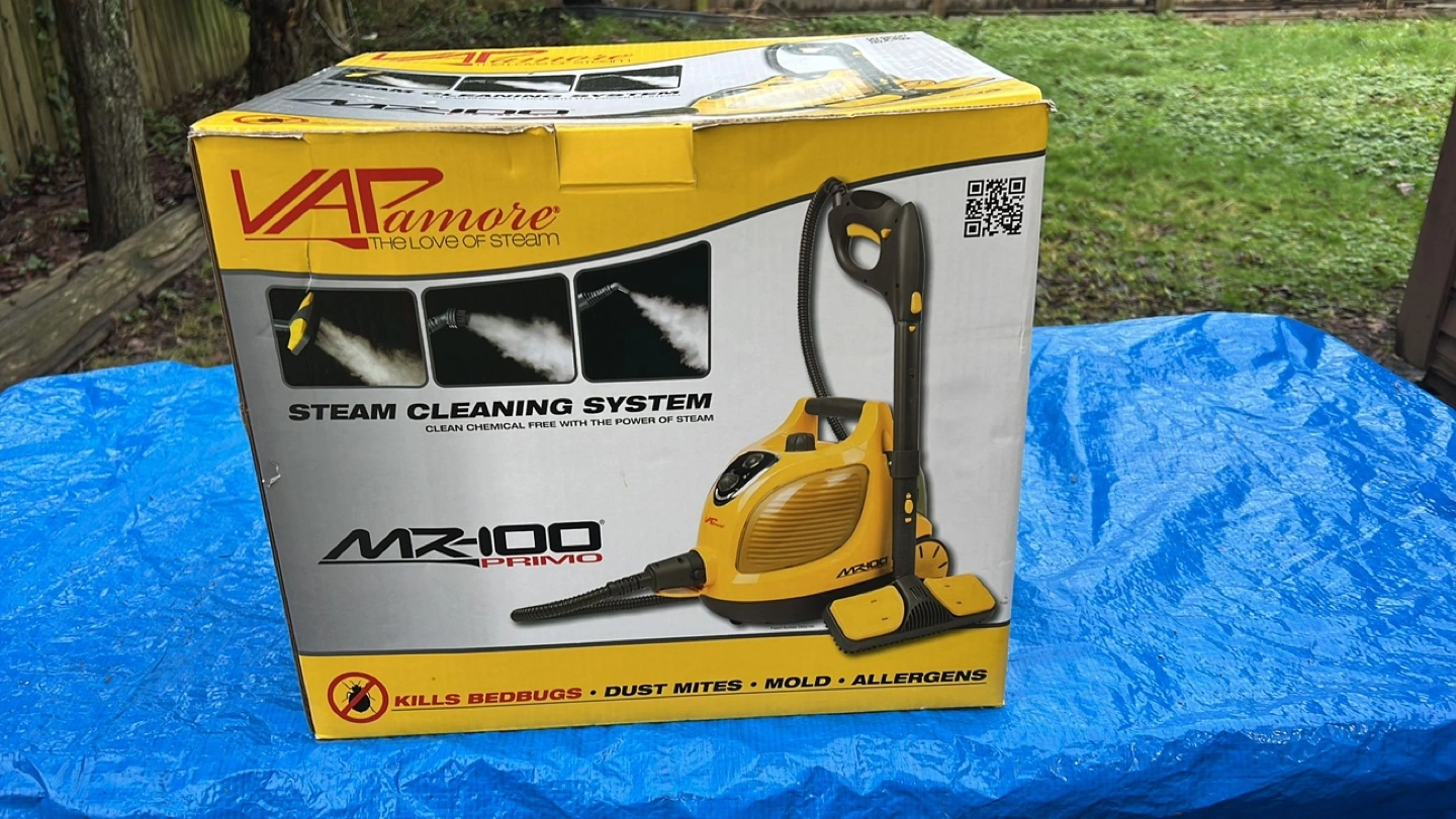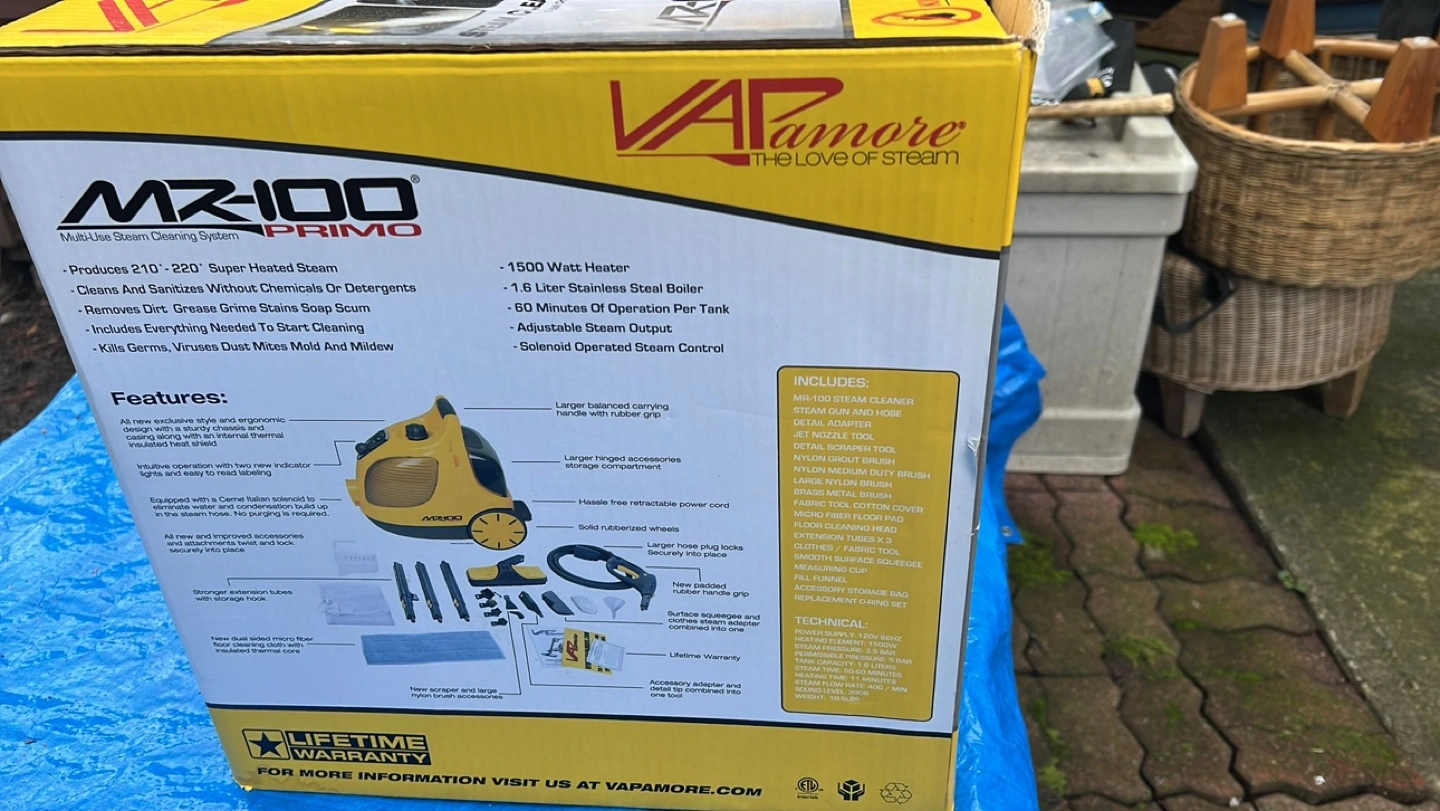 Multi-use steam cleaner. New, in original packaging. 1500 Watt heater, 1.5 Liter stainless steel boiler. Includes various attachments and tools. Kills bedbugs, dust mites, mold, and allergens.