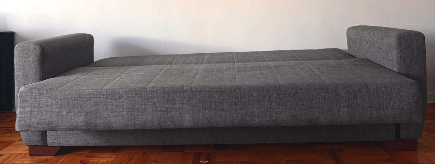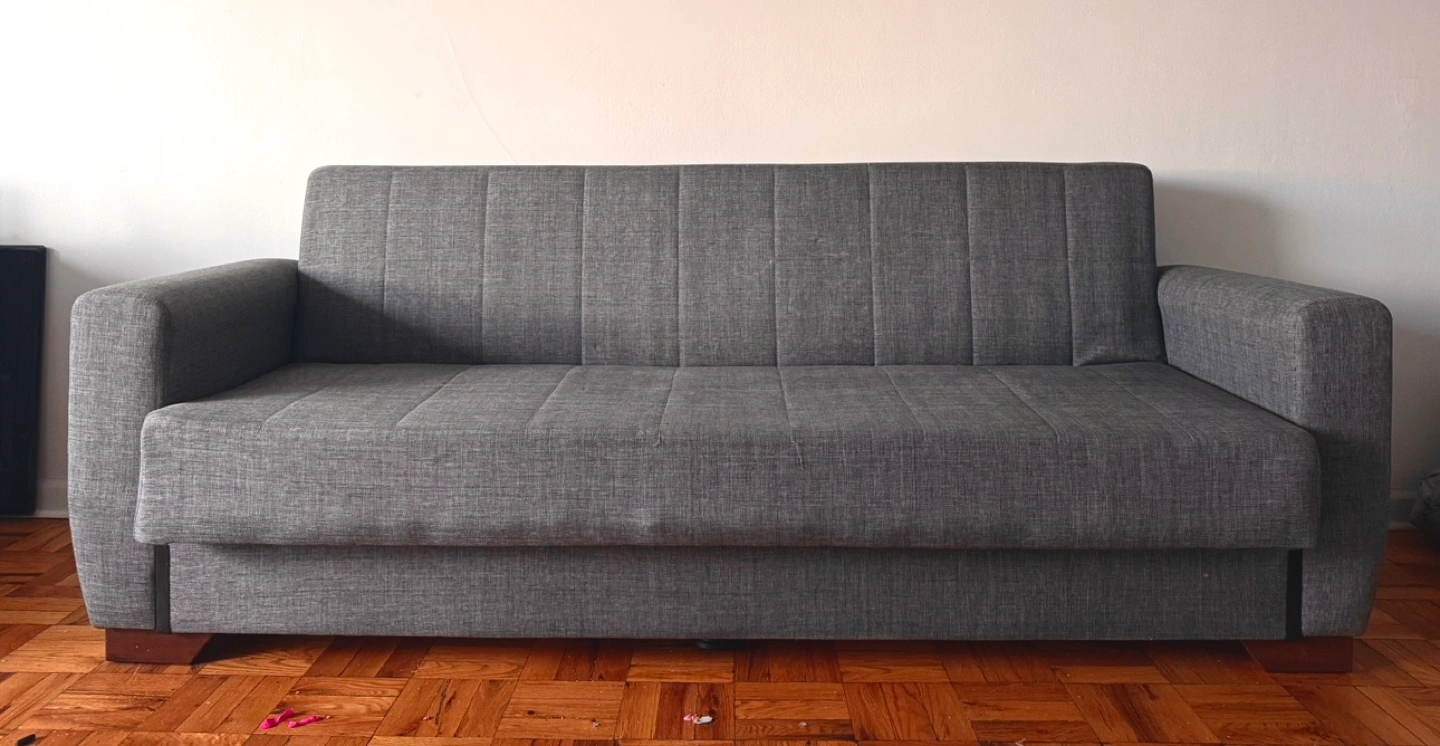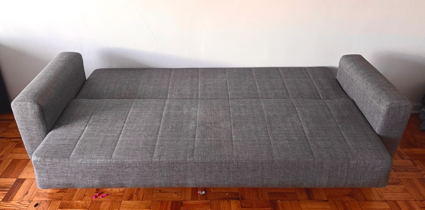 Comfortable gray futon sofa bed. Full-size. Fabric upholstery. Dark wood-toned legs. Clean and ready for a new home.