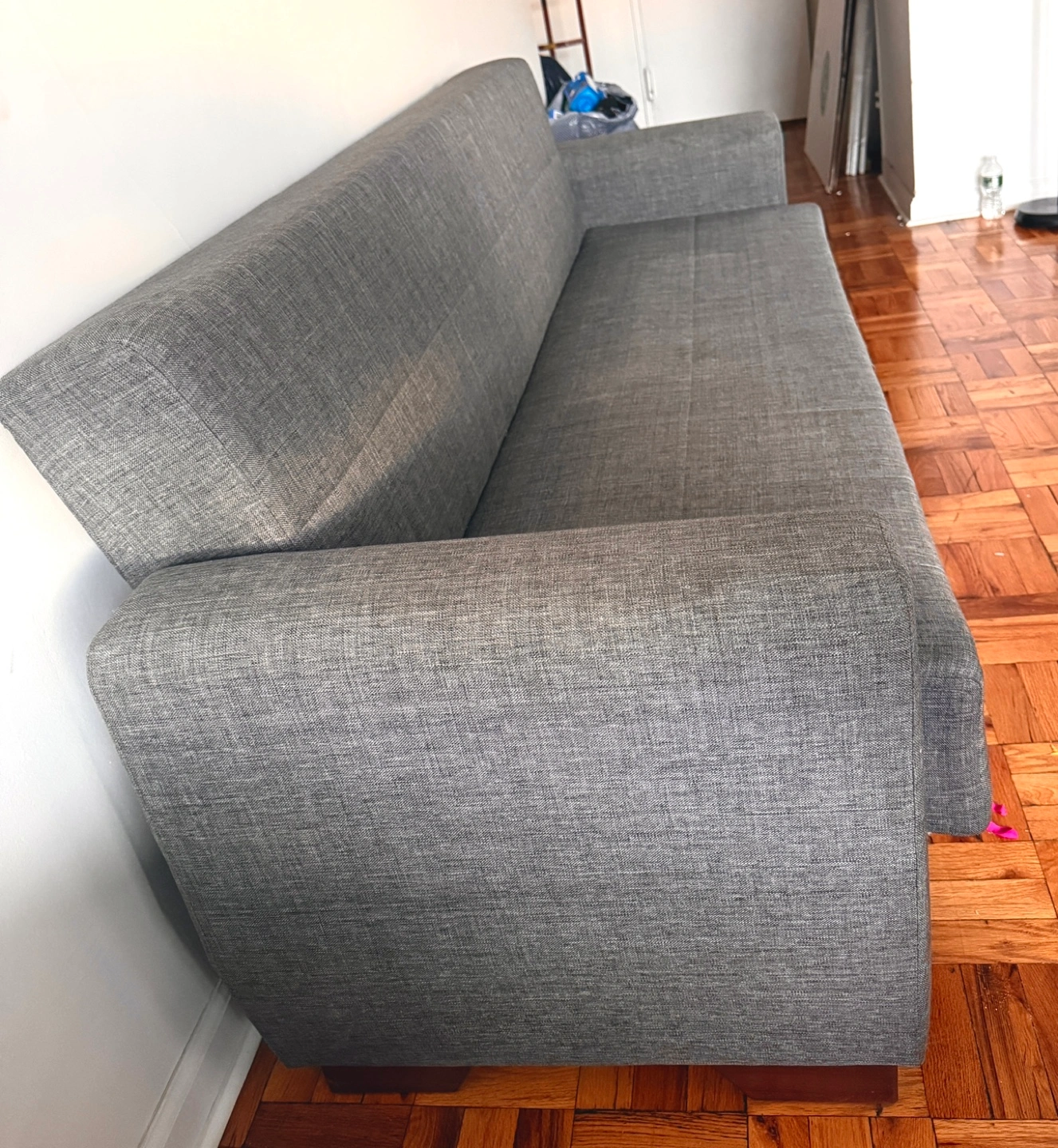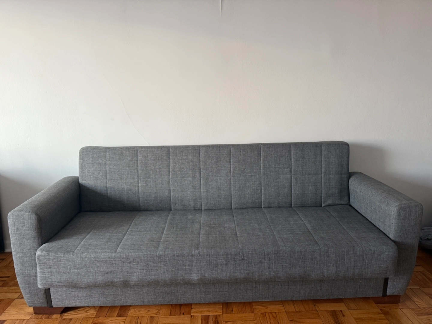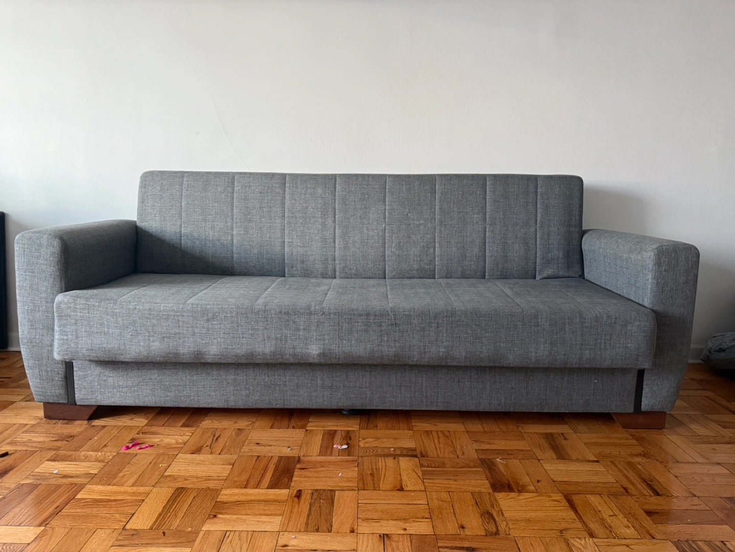 Comfortable gray futon sofa bed. Full-size. Fabric upholstery. Dark wood-toned legs. Clean and ready for a new home.