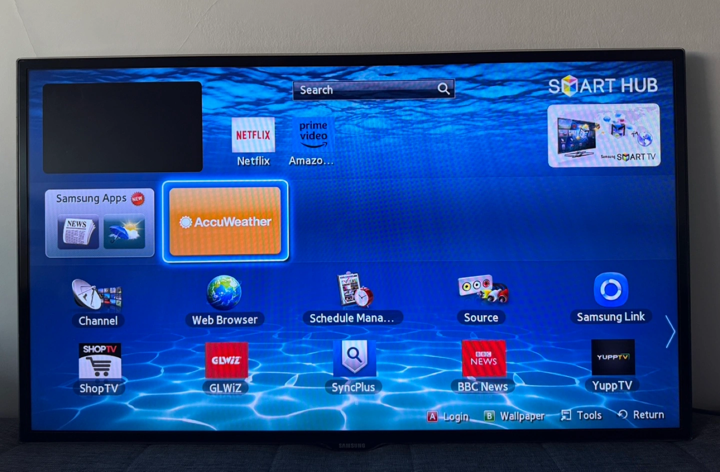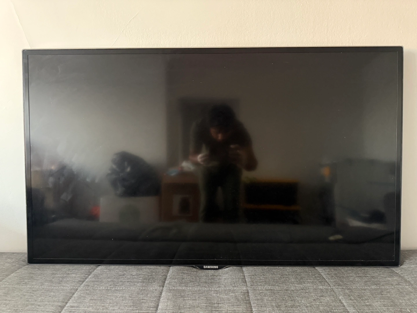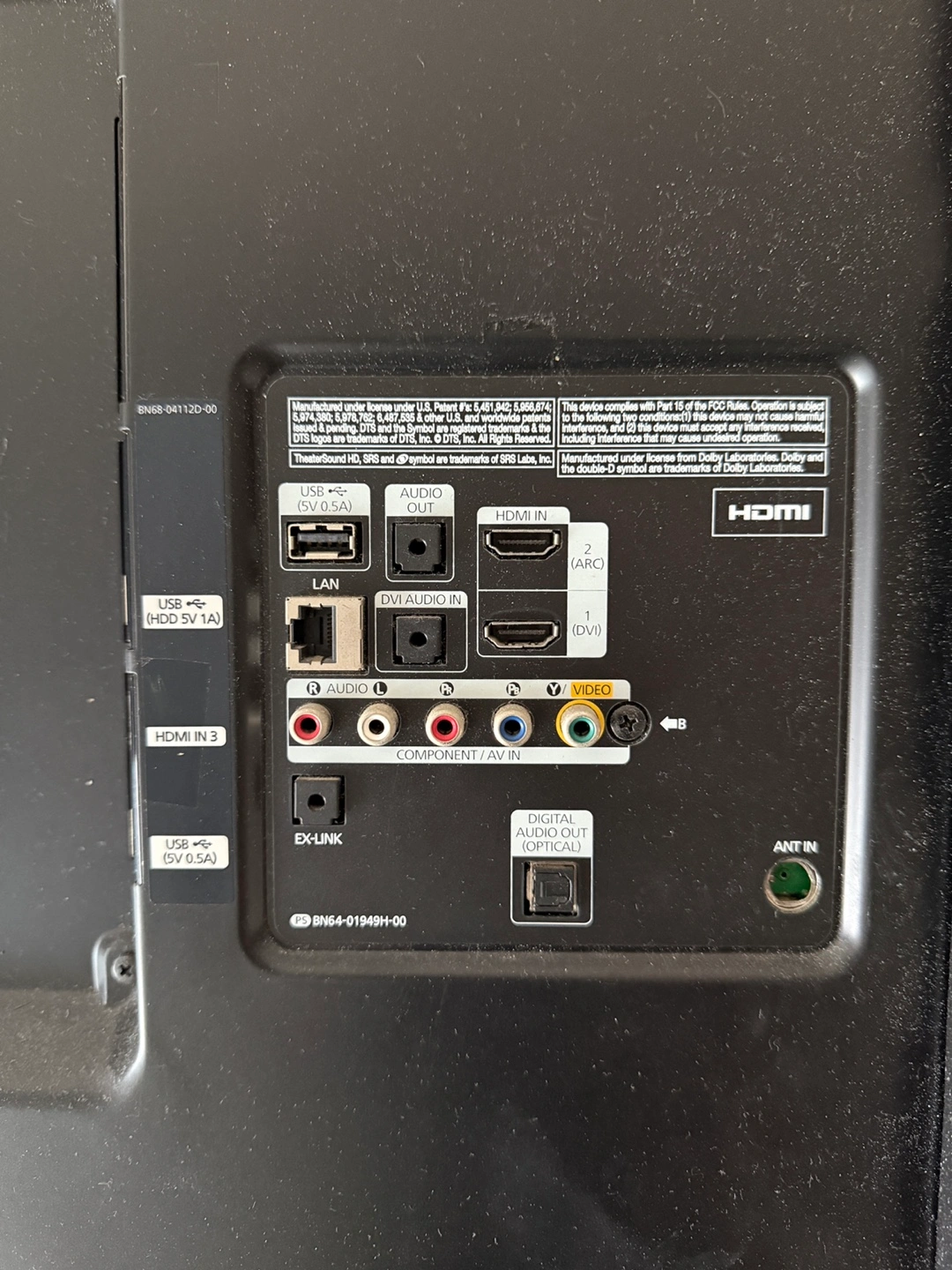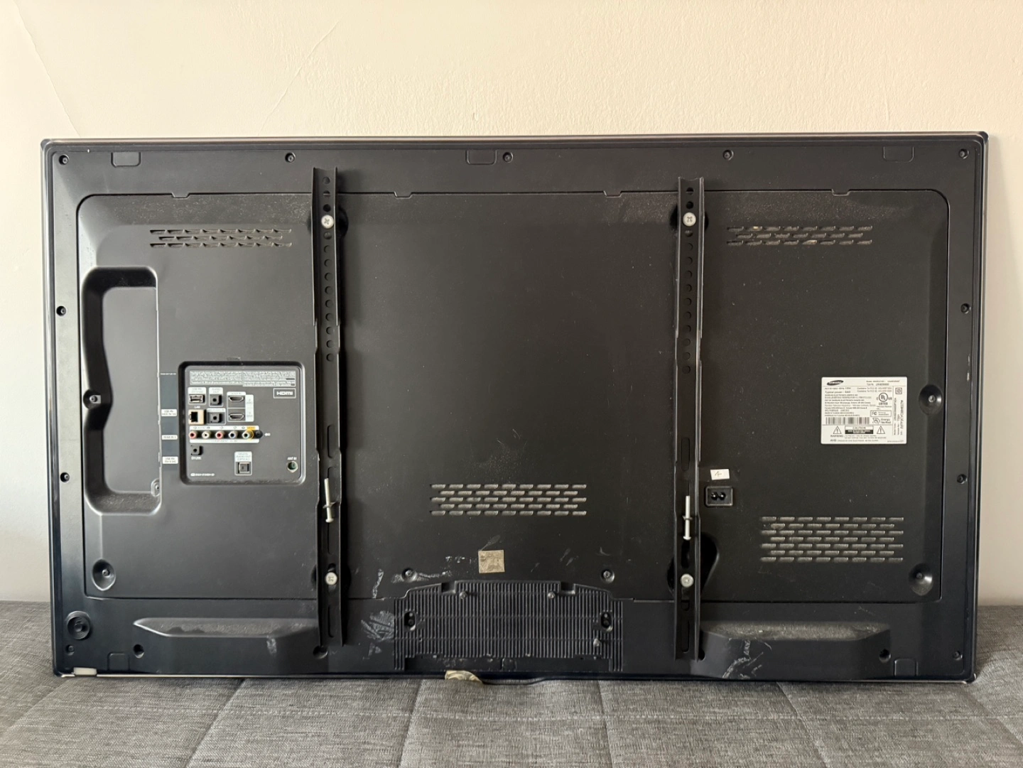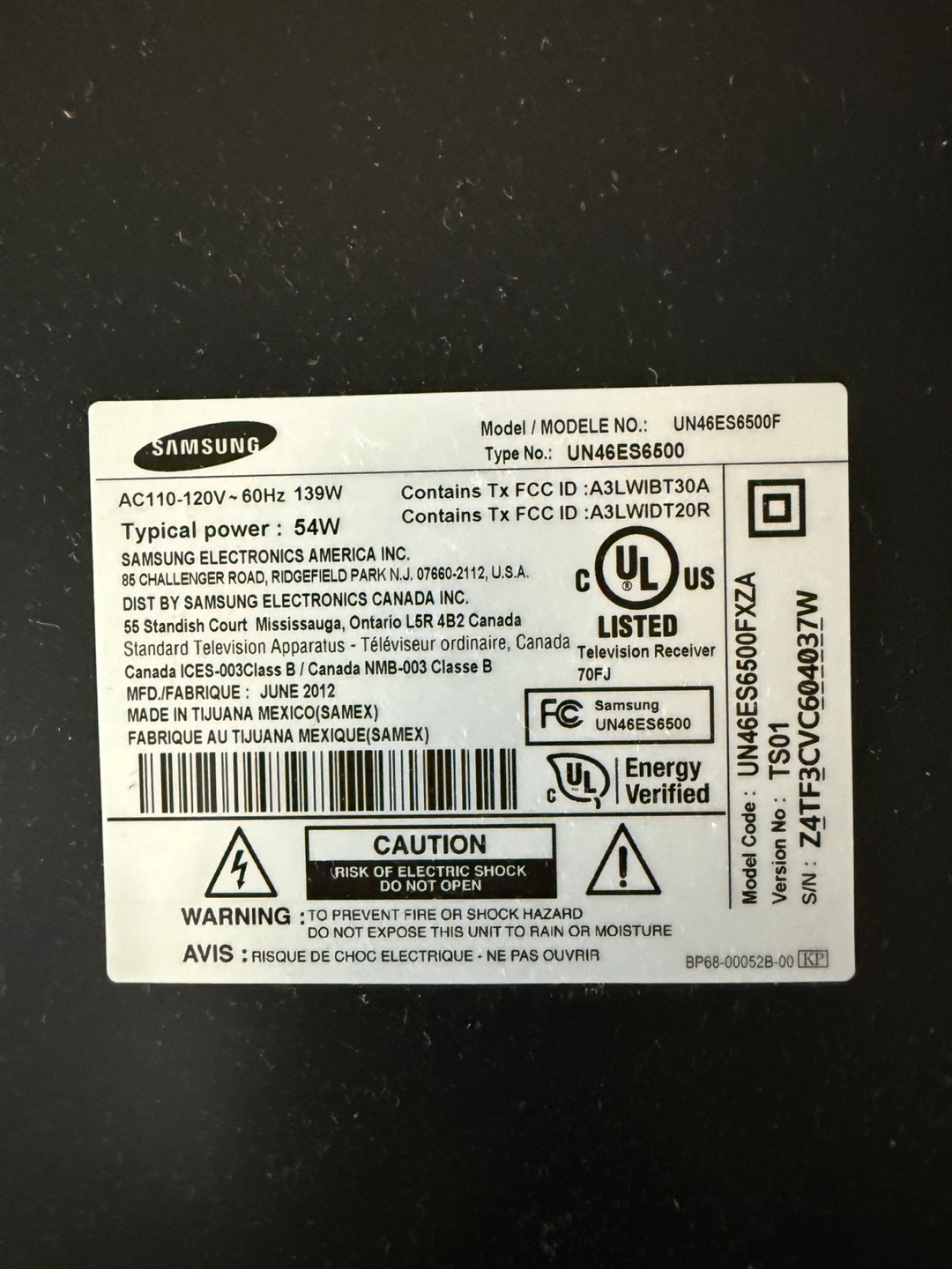 Used Samsung LED HDTV. Model UN46ES6500. Multiple ports including HDMI, USB, and component. Screen shows "No Cable Connected" message. Sold as-is. Comes with TV wall mount