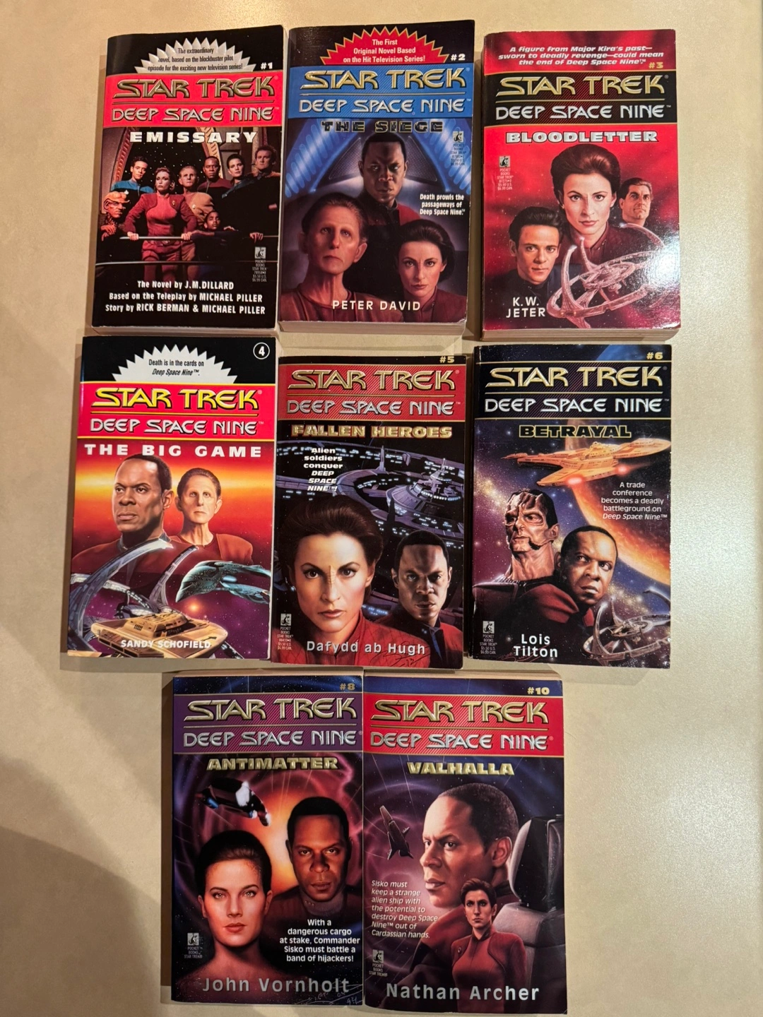 Collection of eight Star Trek Deep Space Nine novels. Includes titles like Emissary, The Siege, Bloodletter, Fallen Heroes, and more. Paperback books in good condition.
