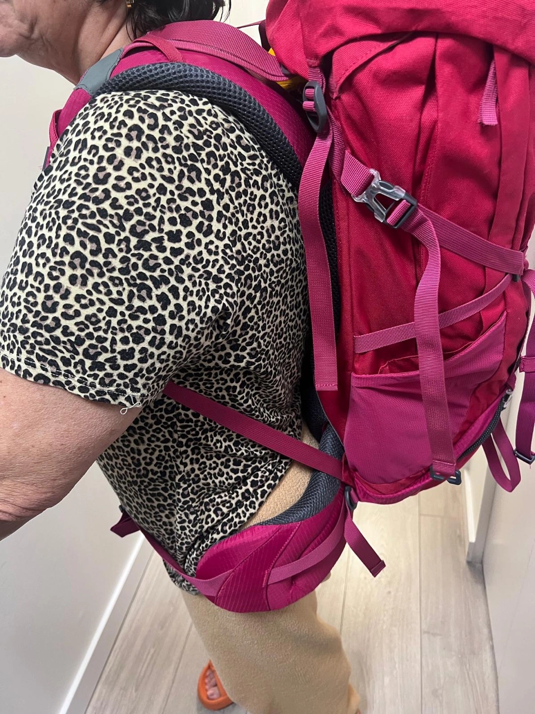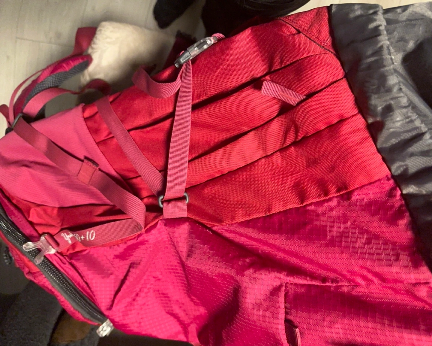 Pink women's hiking backpack. Features adjustable straps and multiple compartments. Good for day hikes or overnight trips. Size Medium. A few minor marks, otherwise in good condition.
