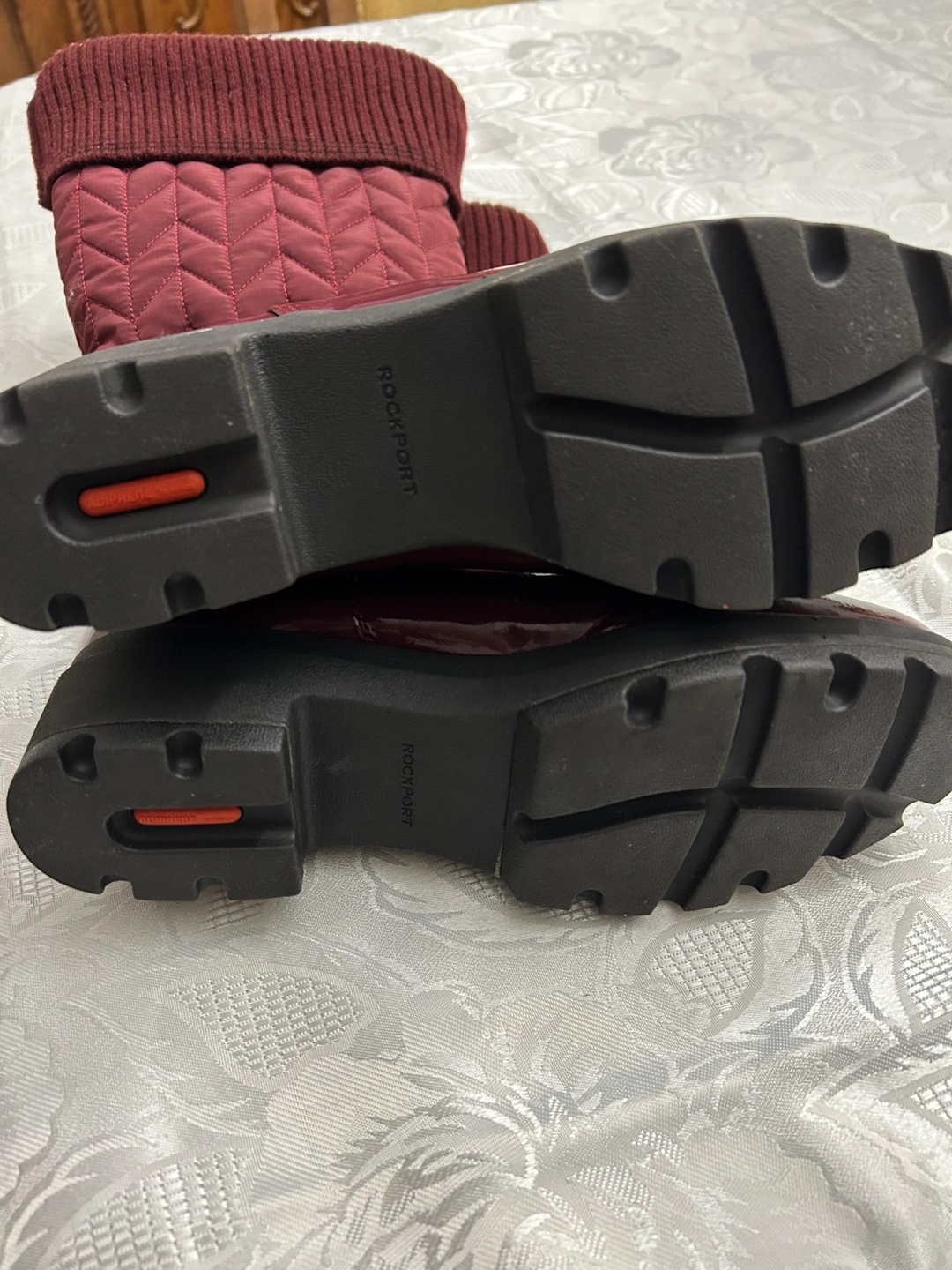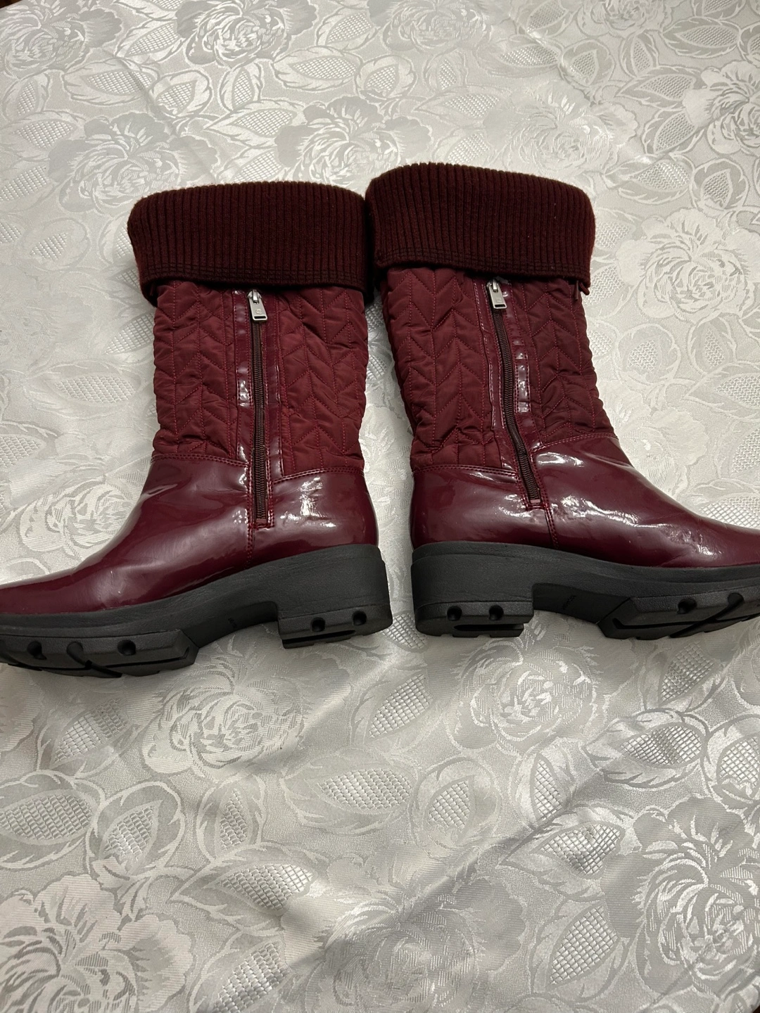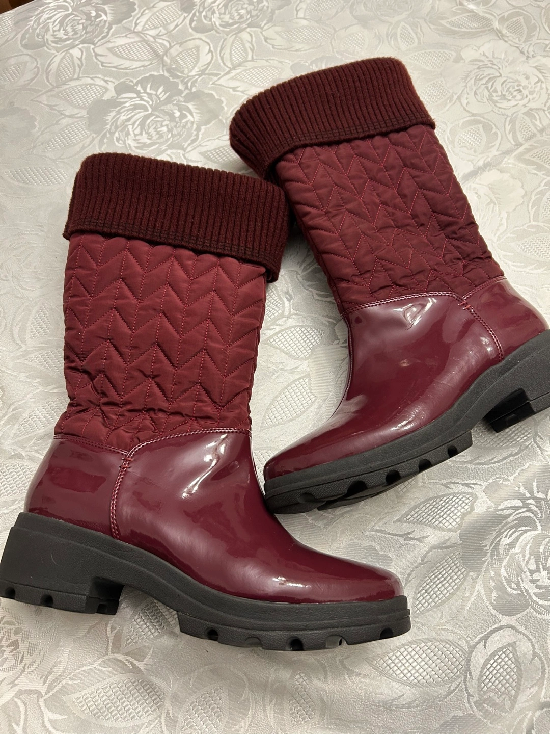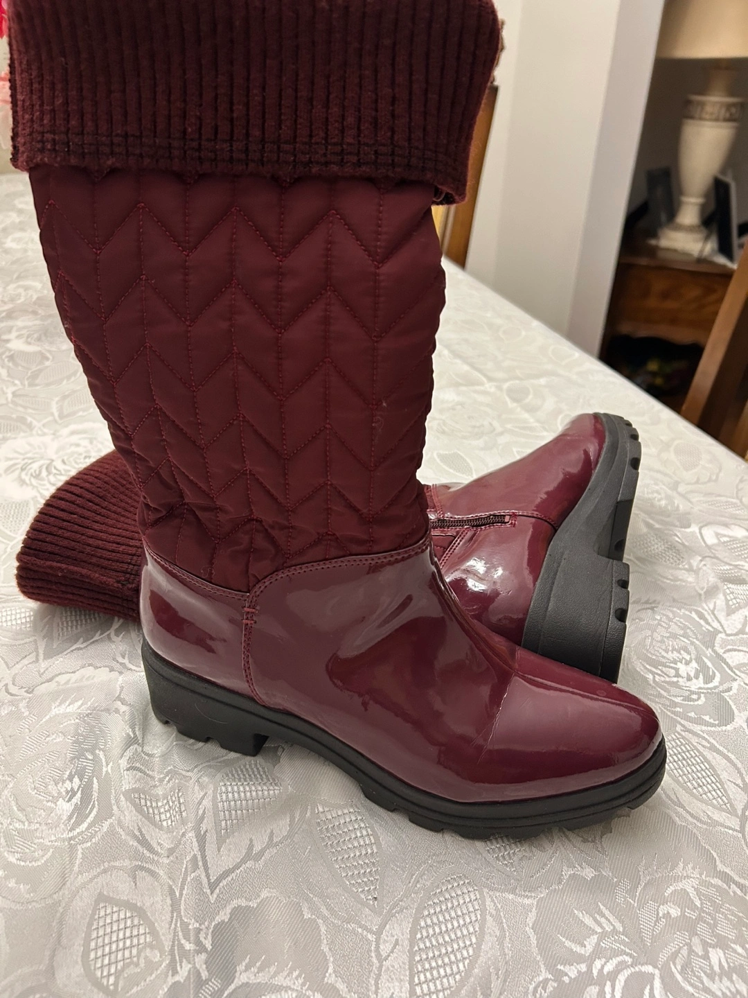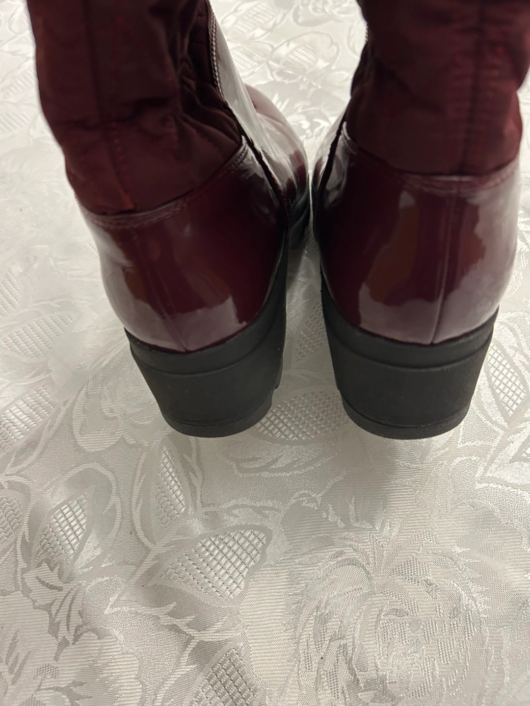 237Women's burgundy quilted winter boots. Features a shiny patent leather lower section and a quilted upper section with a ribbed knit cuff. Side zippers for easy on and off. Durable lug soles. Great for winter weather. They are a tighter fit boot .