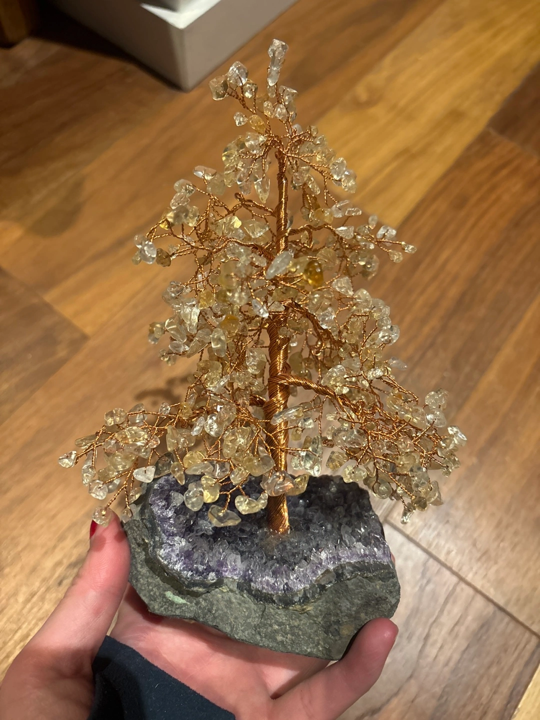 Beautiful handcrafted crystal tree. Features citrine crystals and an amethyst base. Copper wire branches. Unique home decor or gift.