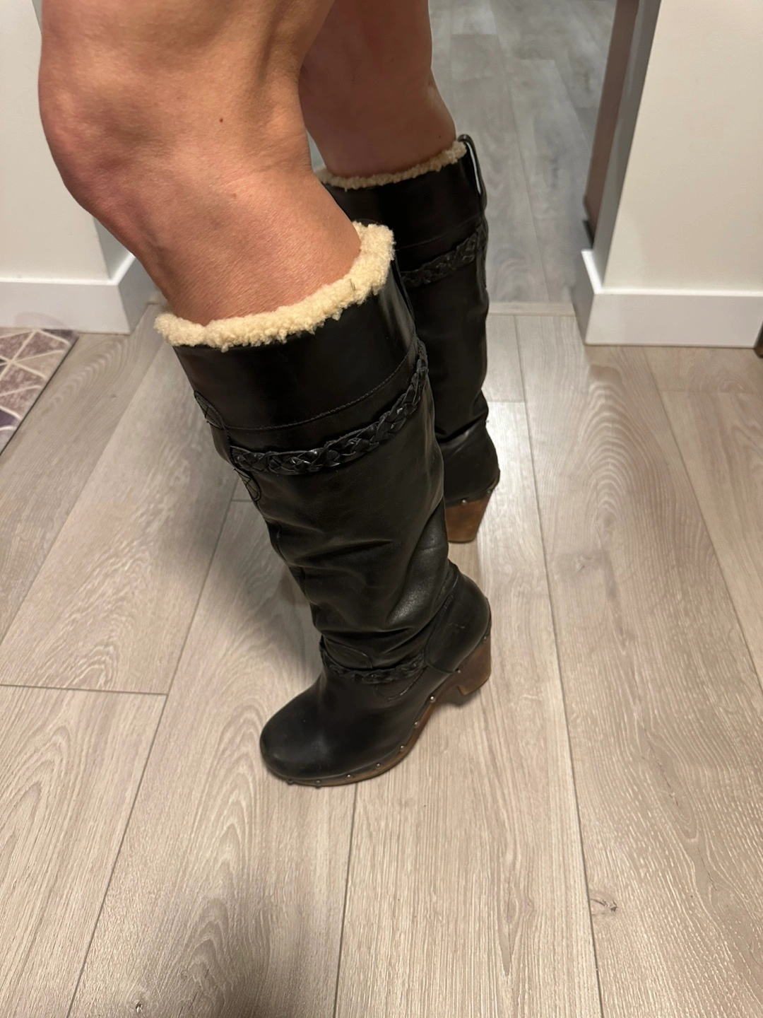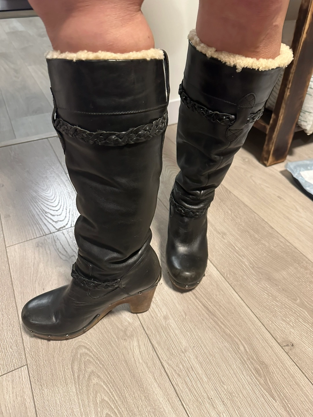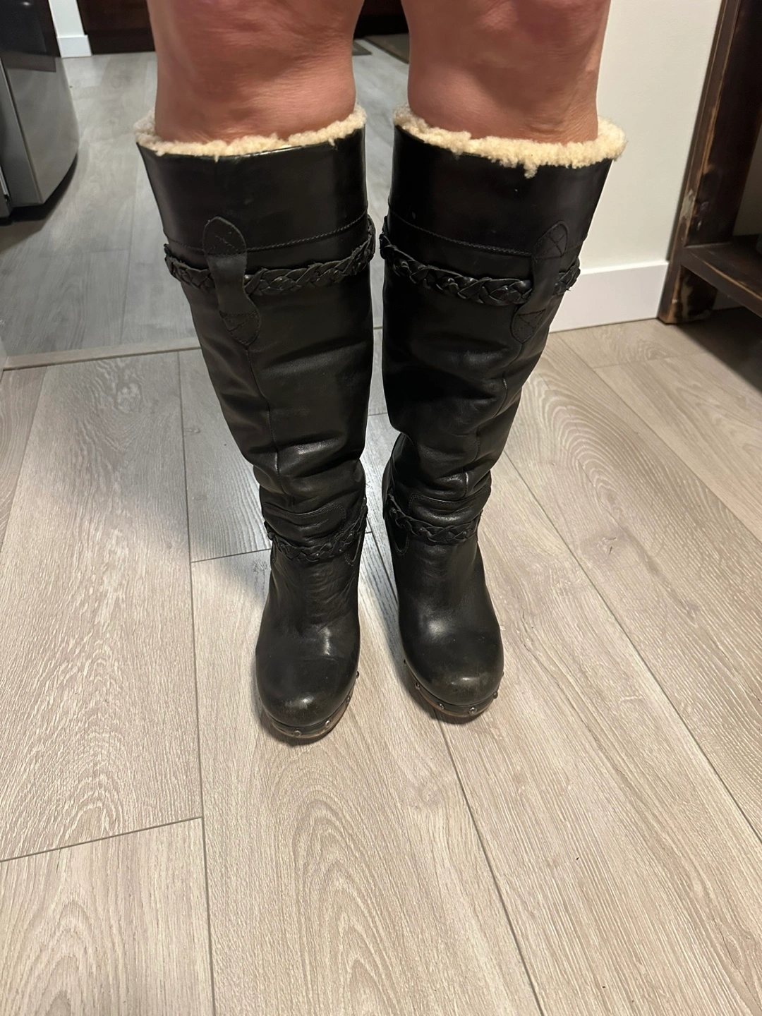 Women's black leather tall boots. Features a braided leather accent and shearling lining. Wooden block heel. Excellent for colder weather.