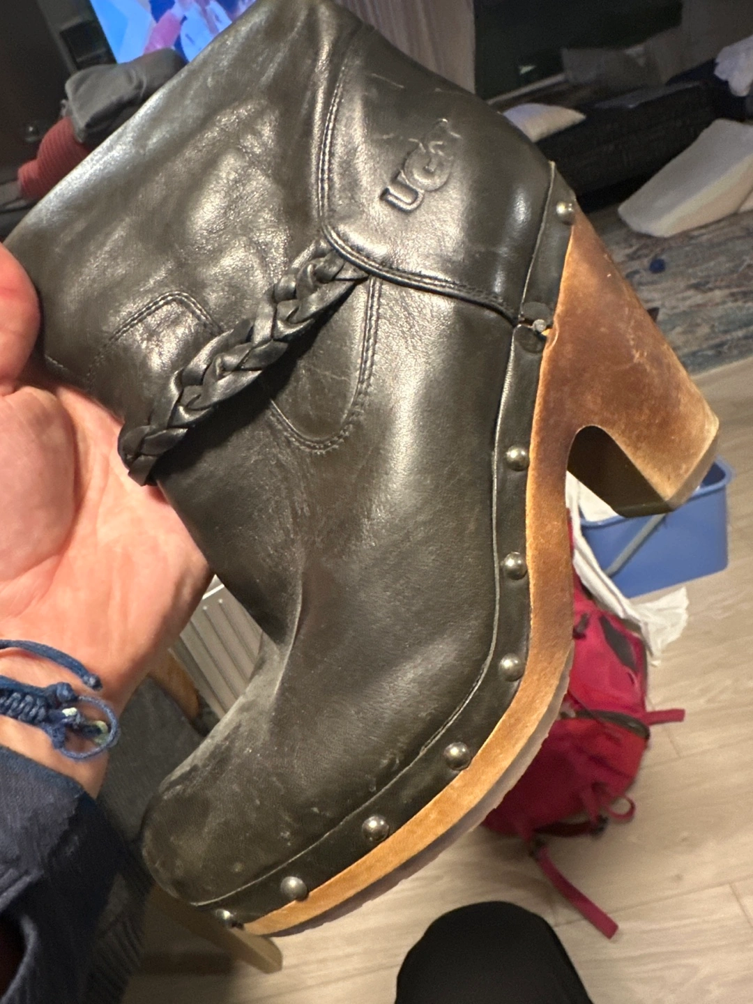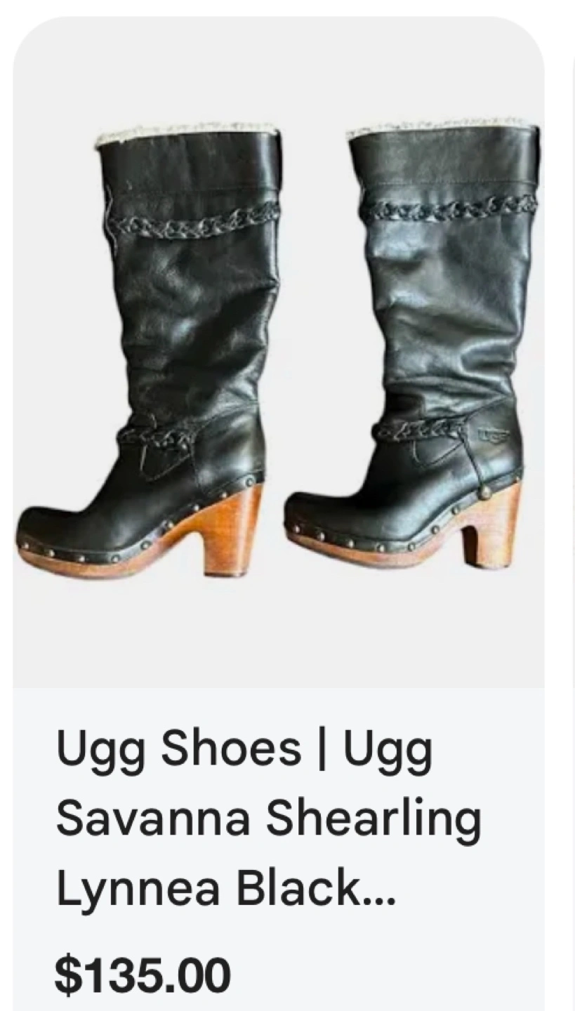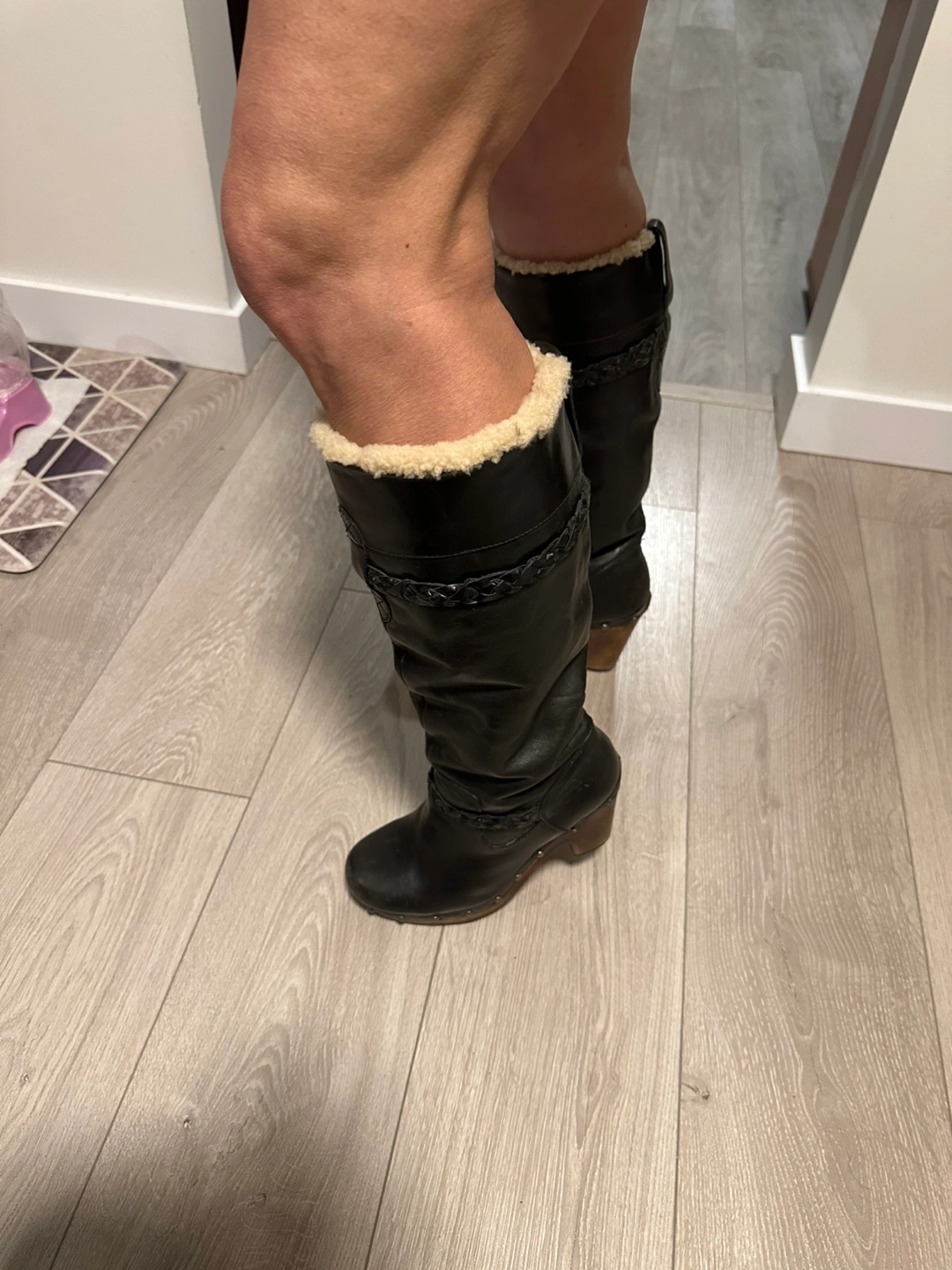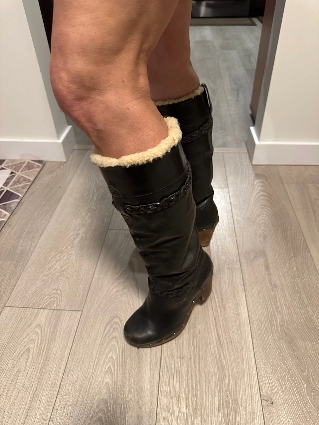 Women's black leather tall boots. Features a braided leather accent and shearling lining. Wooden block heel. Excellent for colder weather.