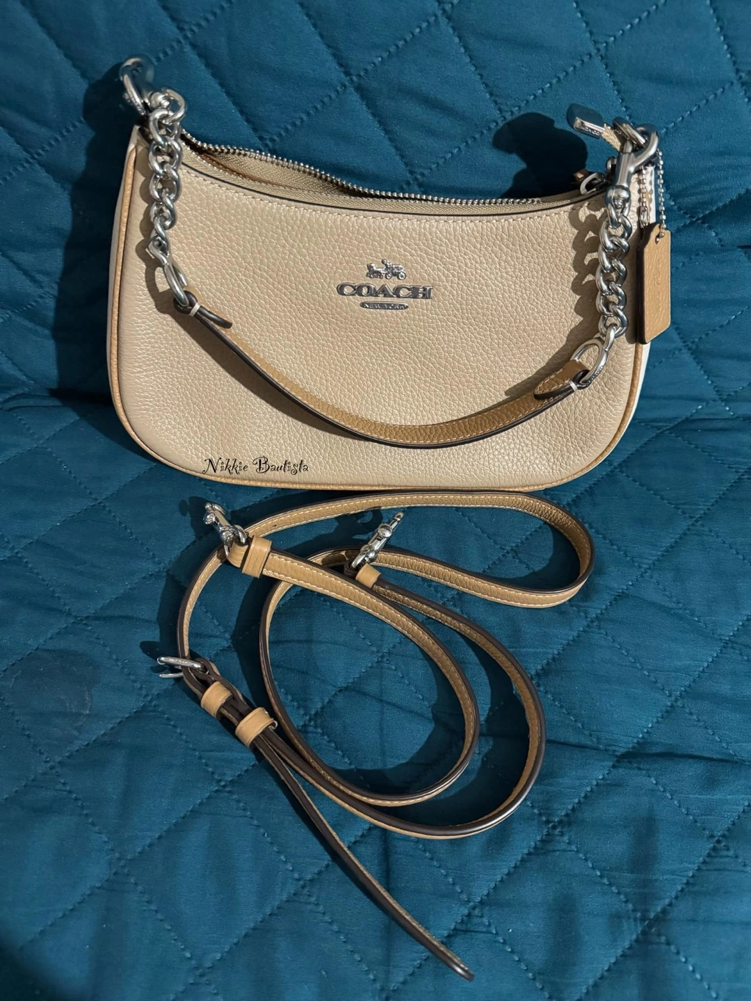 Coach Teri Shoulder Bag in brand new without tag condition. Detachable strap allows crossbody wear, matching diverse styles. Inside pocket, card slots, and zip-top closure secure essentials.