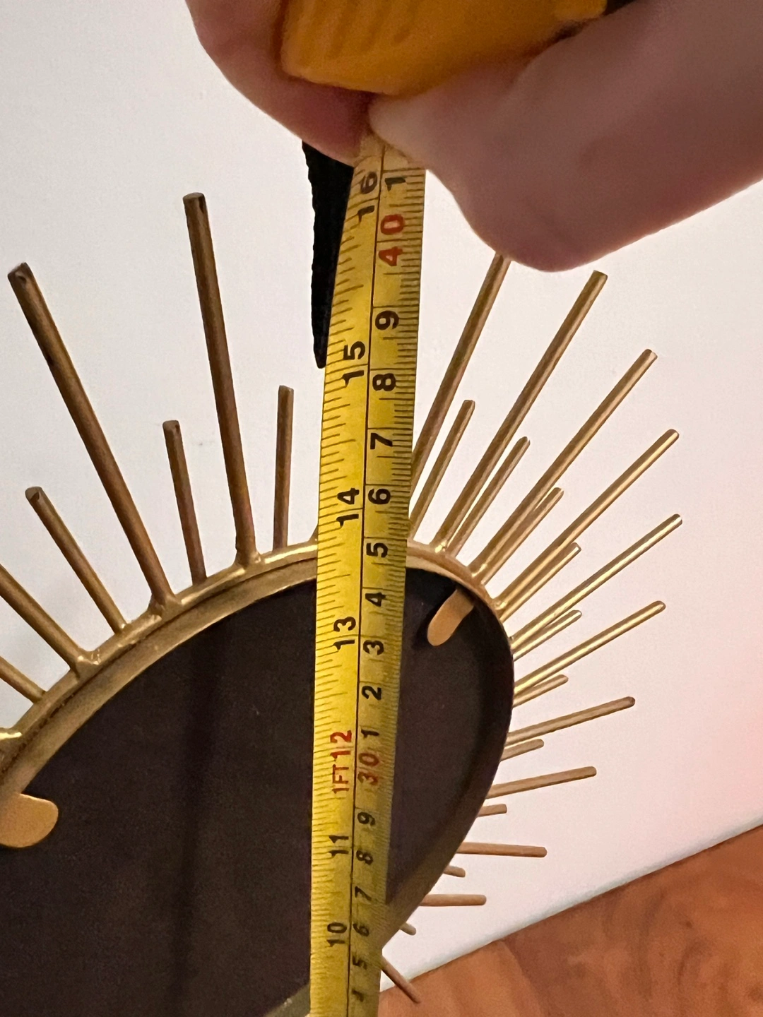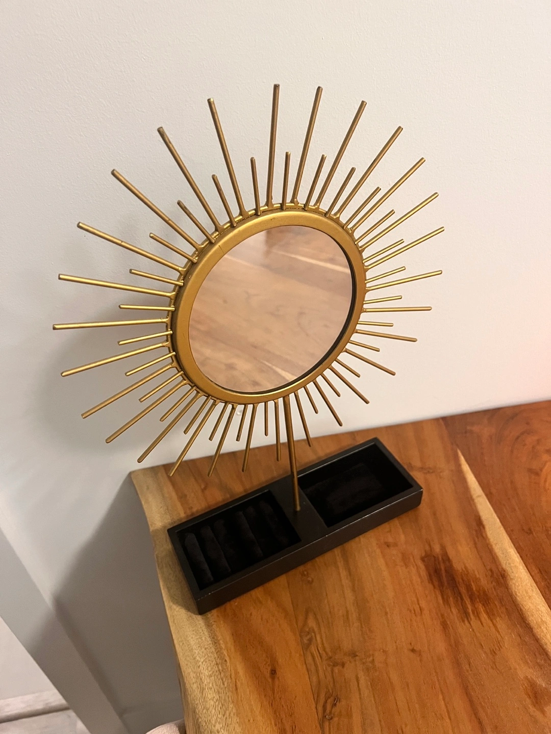 Beautiful gold sunburst jewellery organizer. Features a small mirror and compartments for rings and other small items. Measures approximately 16 cm tall.