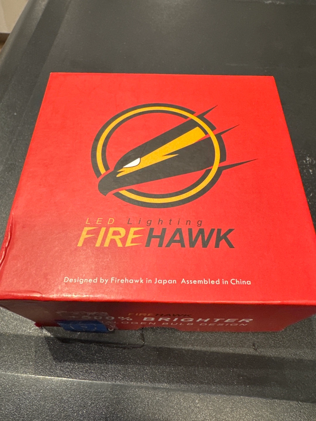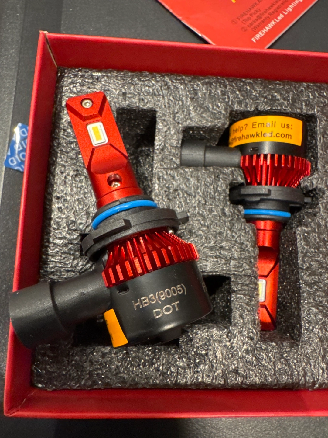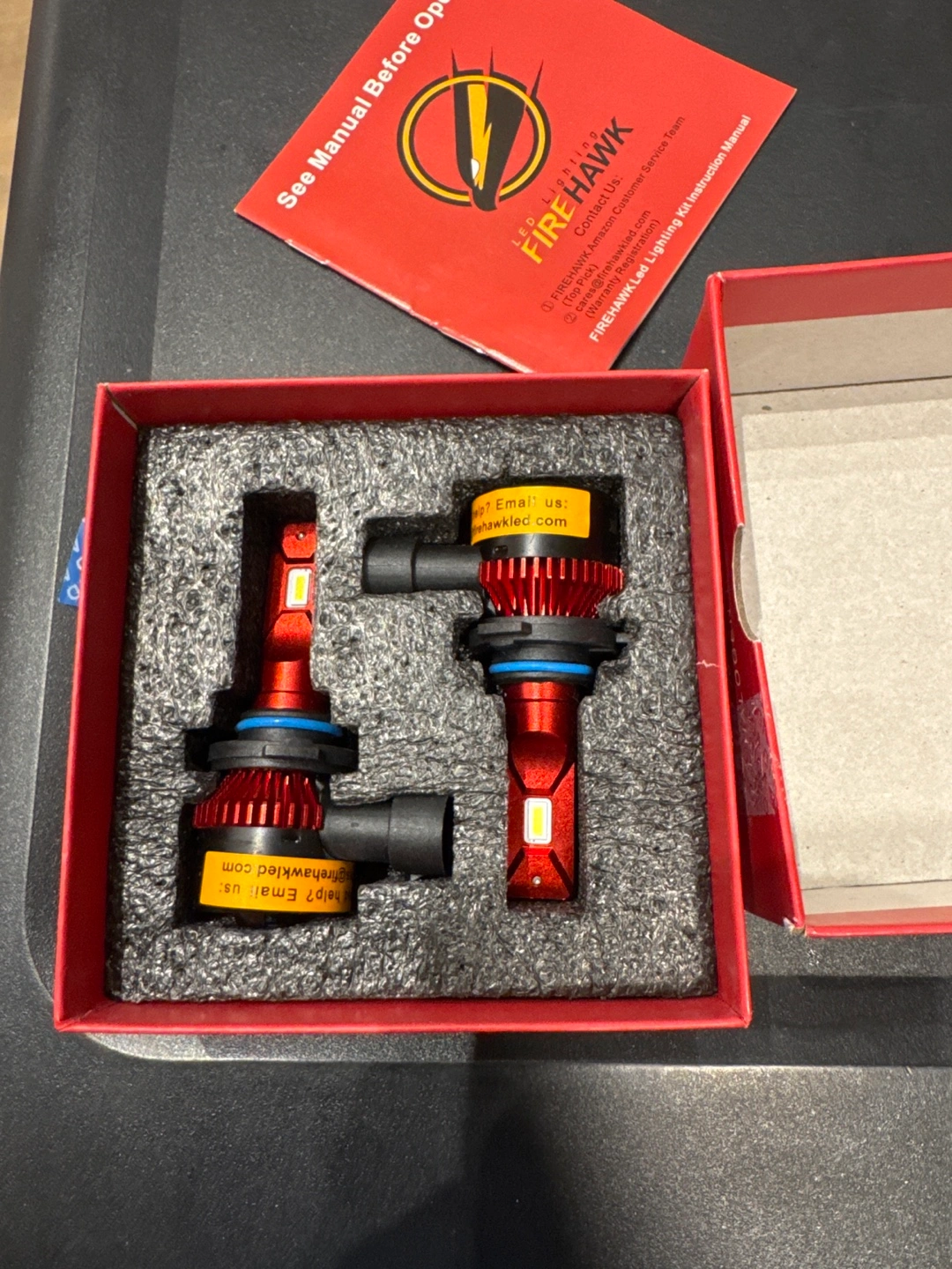 Pair of new Firehawk LED headlight bulbs. Red accents. Designed in Japan, assembled in China. Includes instruction manual. DOT approved.
