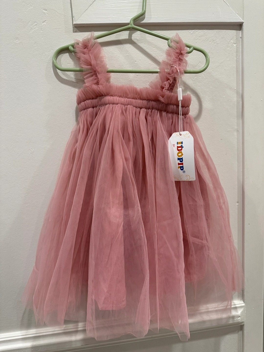 Dusty rose tulle dress. Features ruffled straps and elastic waistband. Size 24 months. Perfect for special occasions.