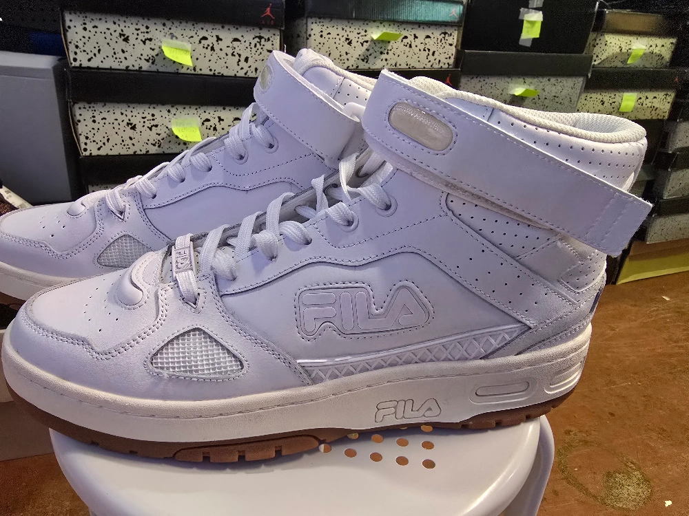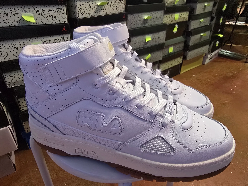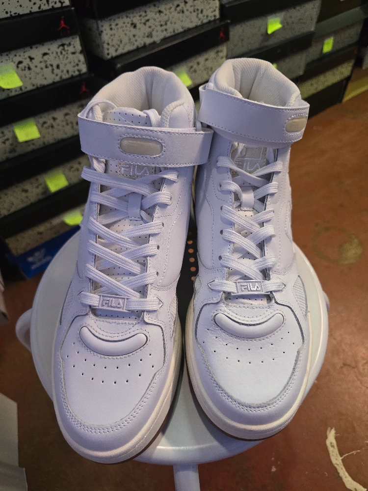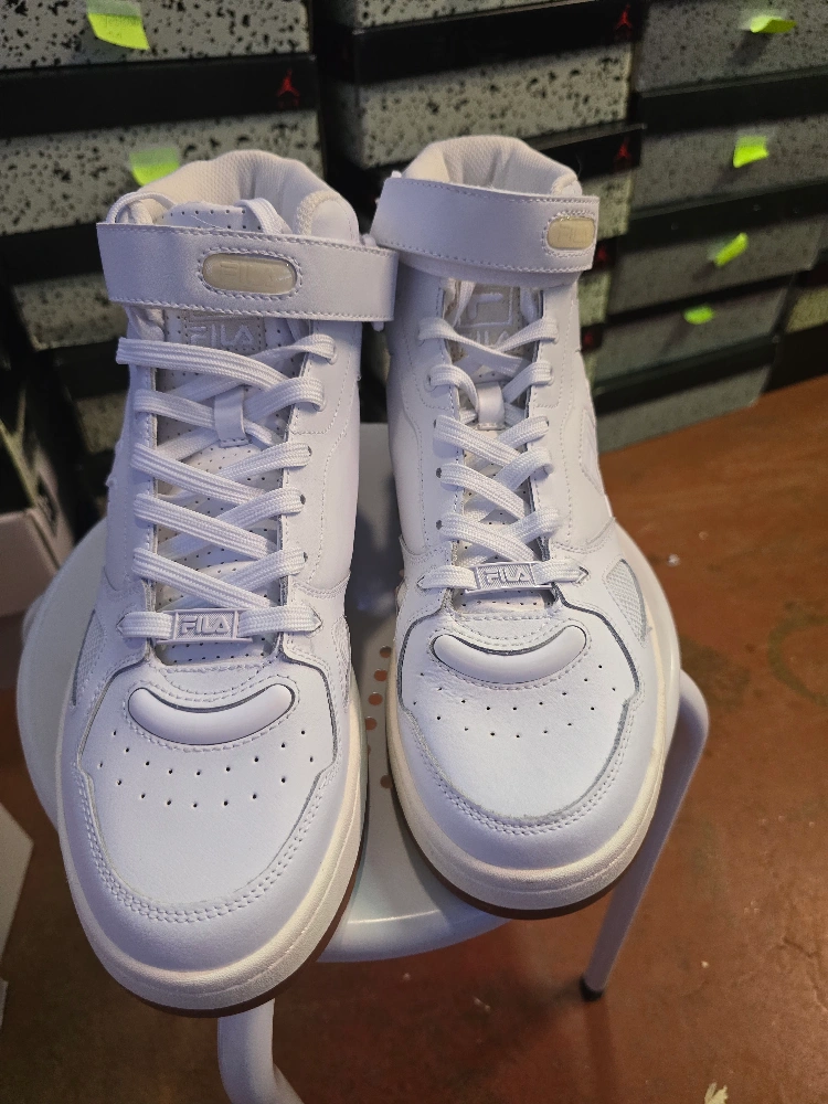 Brand new Pair of Fila high-top sneakers. White leather upper. Strap closure. White laces. Gum sole. Excellent condition.Never used available size 12 for sale only $75 for more info contact me anytime π