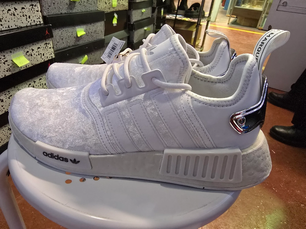 Brand new Women's Adidas NMD_R1 sneakers. White velvet upper, silver accents. 2 Sizes available New with tag.Sale with box never used for sale $125 for more info contact me anytime ๐ ๐