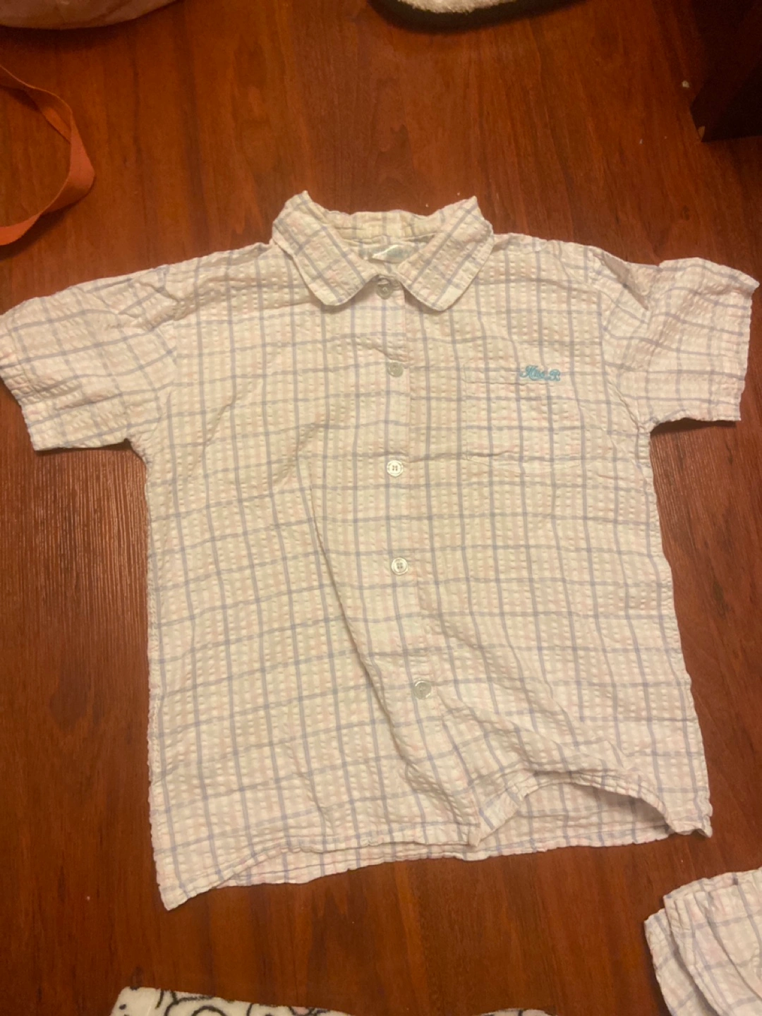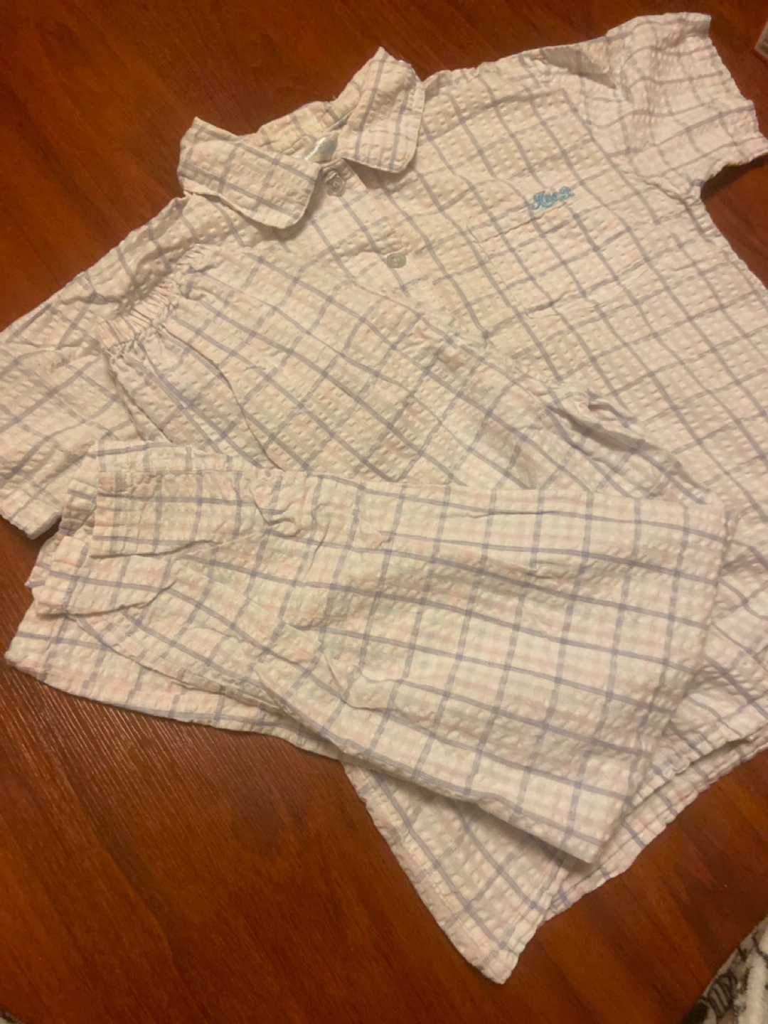 Adorable girls' pajama set. Features a collared button-up top and coordinating pants. Lightweight and breathable fabric. Perfect for summer nights. Price and meeting place negotiable.