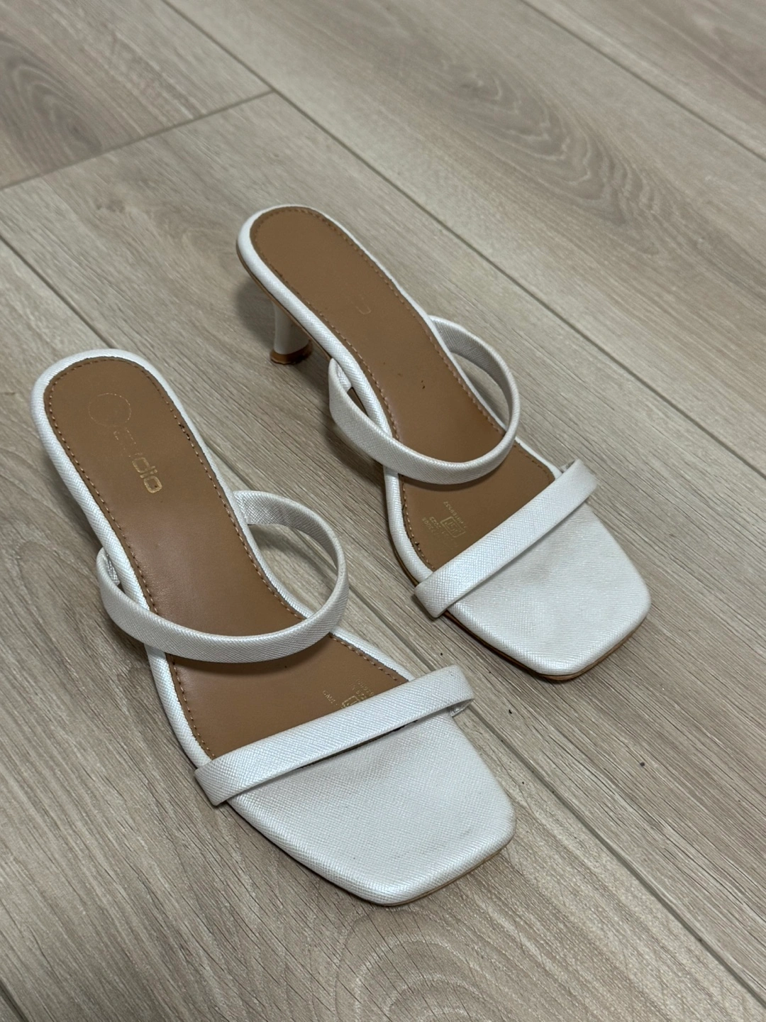 39Elegant white heels. Low kitten heel. Double strap design. Square toe. Size 9.