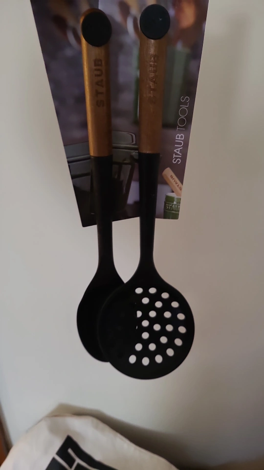 Two nylon cooking spoons. One slotted spoon, one solid spoon. Wooden handles. Black nylon heads. Brand new, never used.