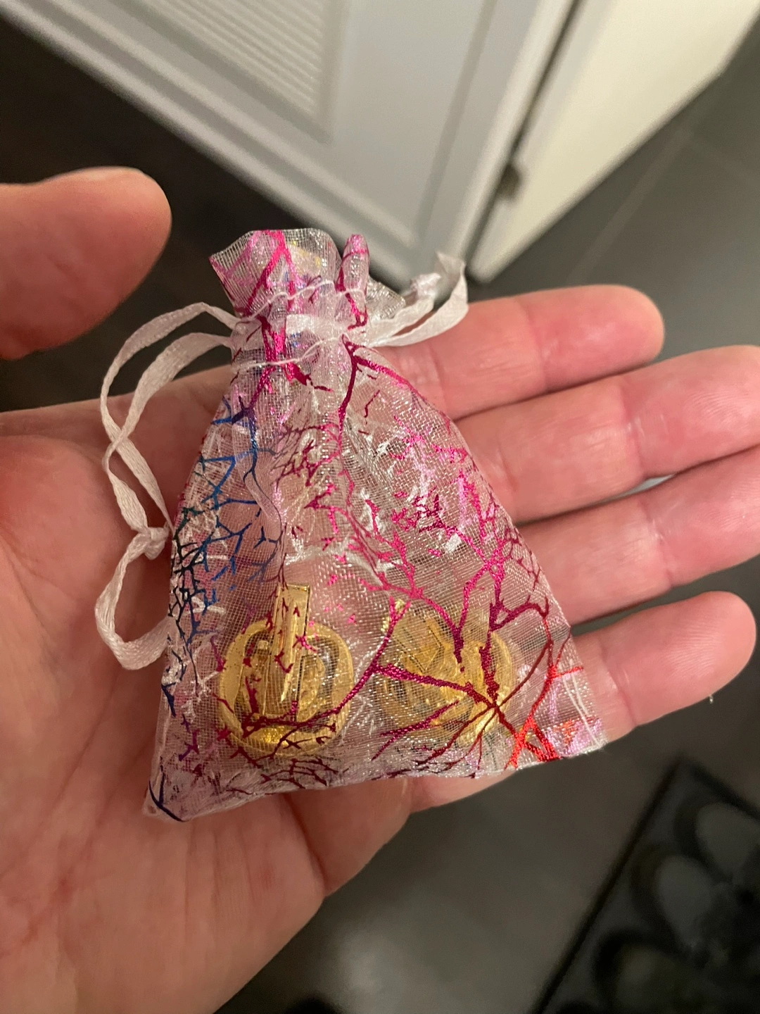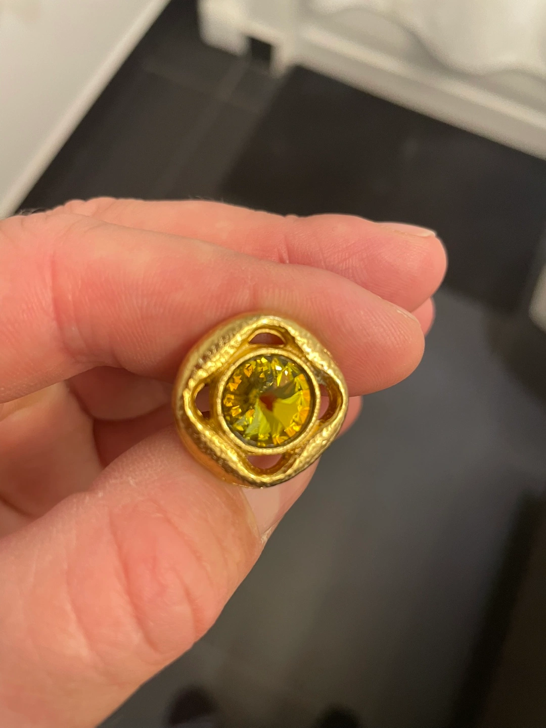 Pair of gold cufflinks. Features a square setting with a yellow gemstone. Presented in a decorative organza bag. Looks vintage.